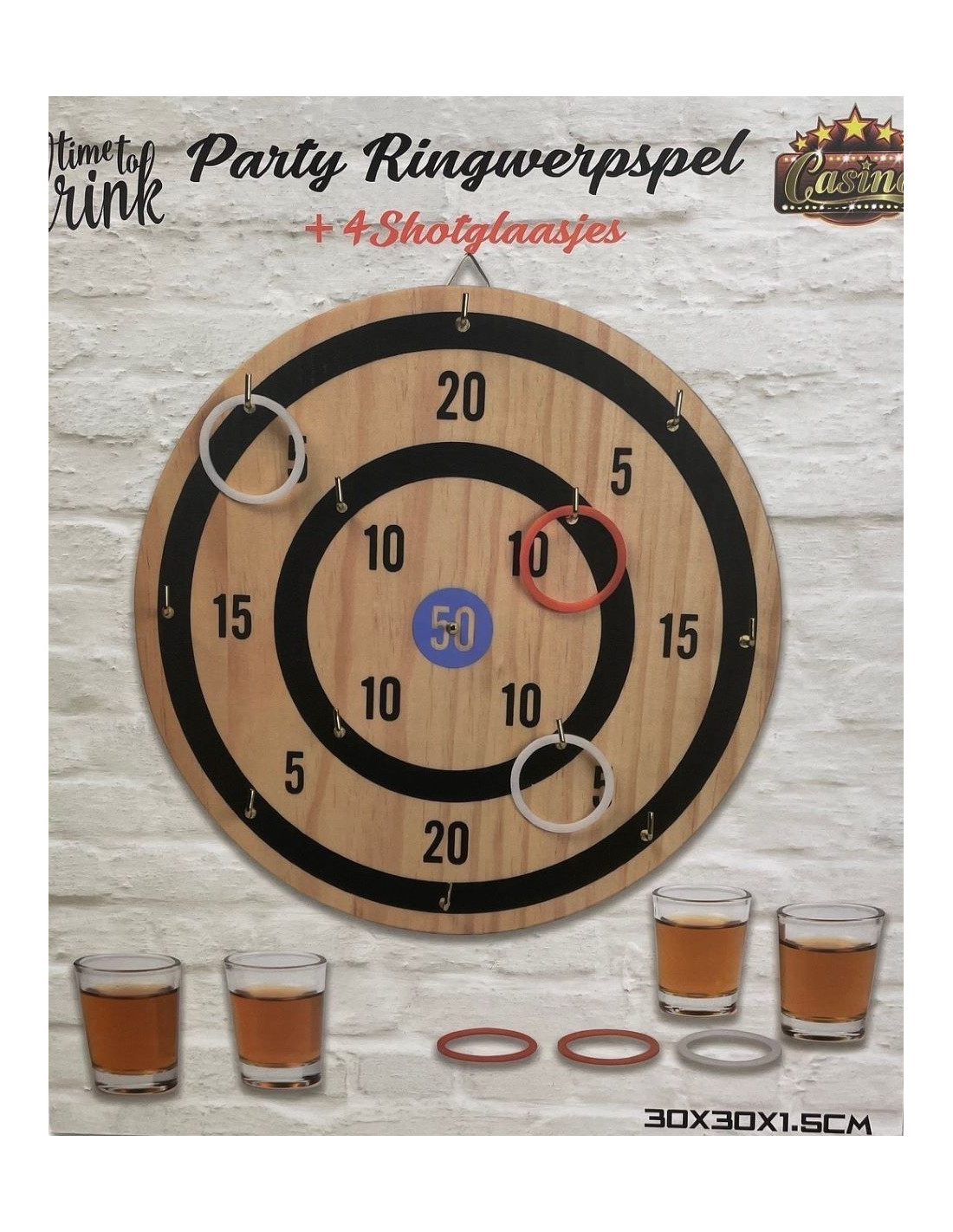 houten bord met een diameter van 30 cm met ringen en shotglaasjes houten bord 4 glazen shotglaasjes 6 werpringen metalen haakjes