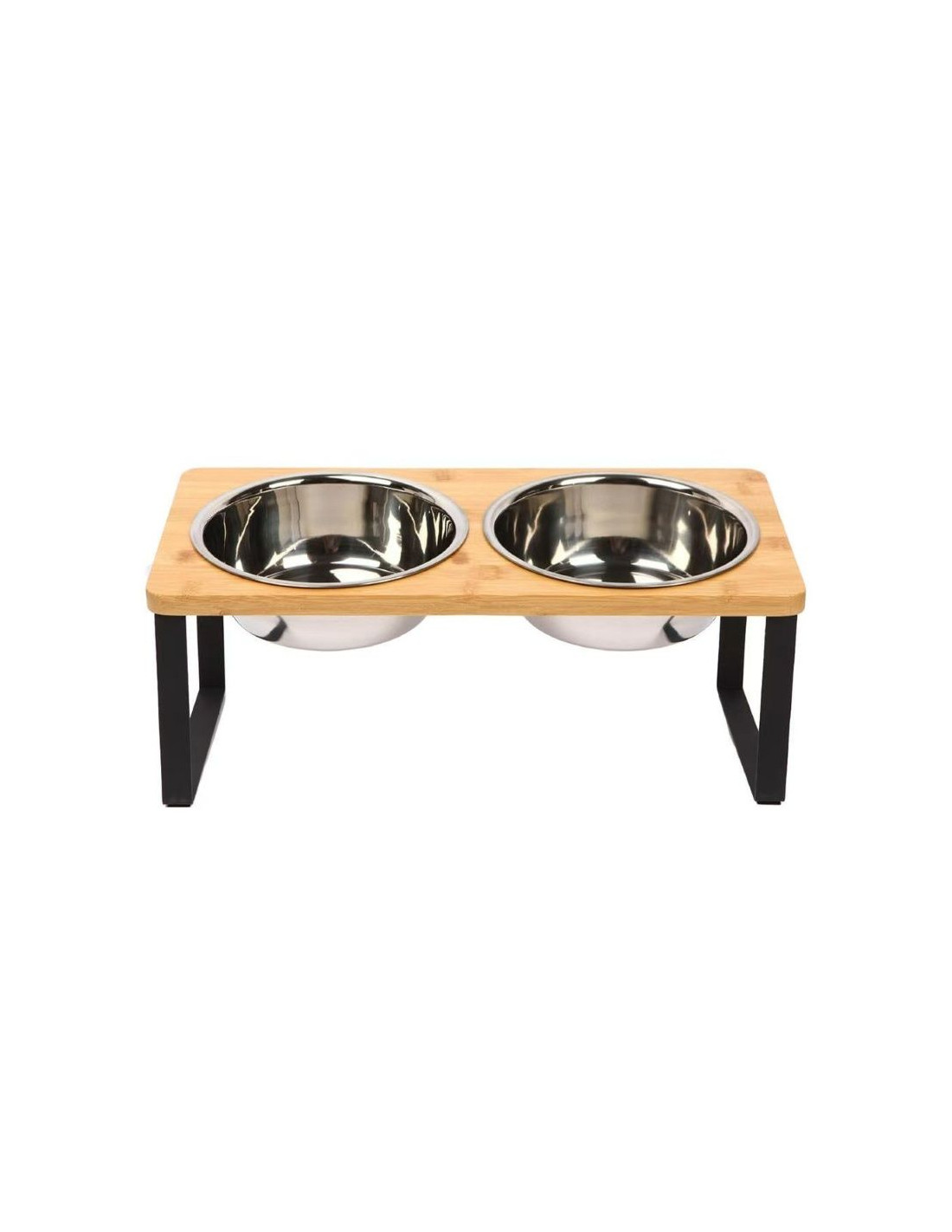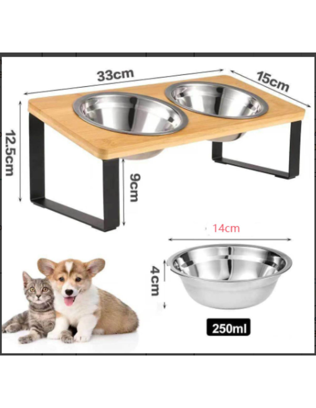 geschikt voor kleine honden afmeting: 33 x 15 x H 12.5 cm diameter voerbakken: 13 cm diepte voerbakken: 4 cm materiaal voerbakken: roestvrijstaal materiaal standaard: bamboe (waterafstotend) + metaal anti-slip rubber is meegeleverd gewicht: ca. 800 gram montagetijd: 2 minuten merk: Ceruzo