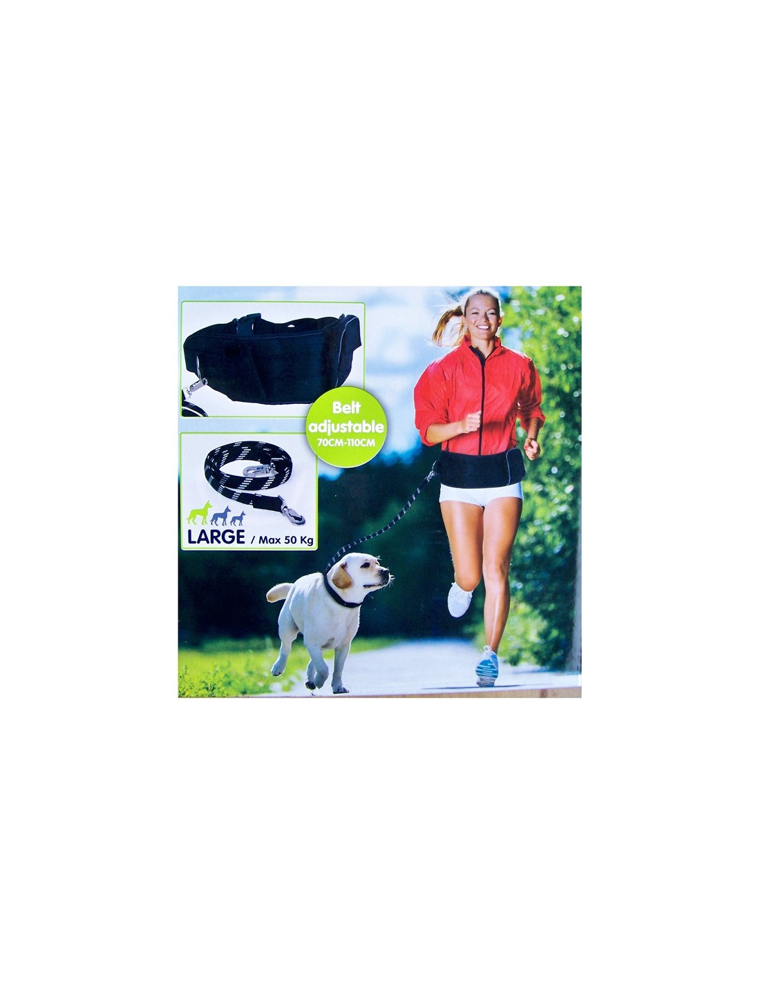 - De riem wordt met een karabijnhaak bevestigd aan hond en heupband