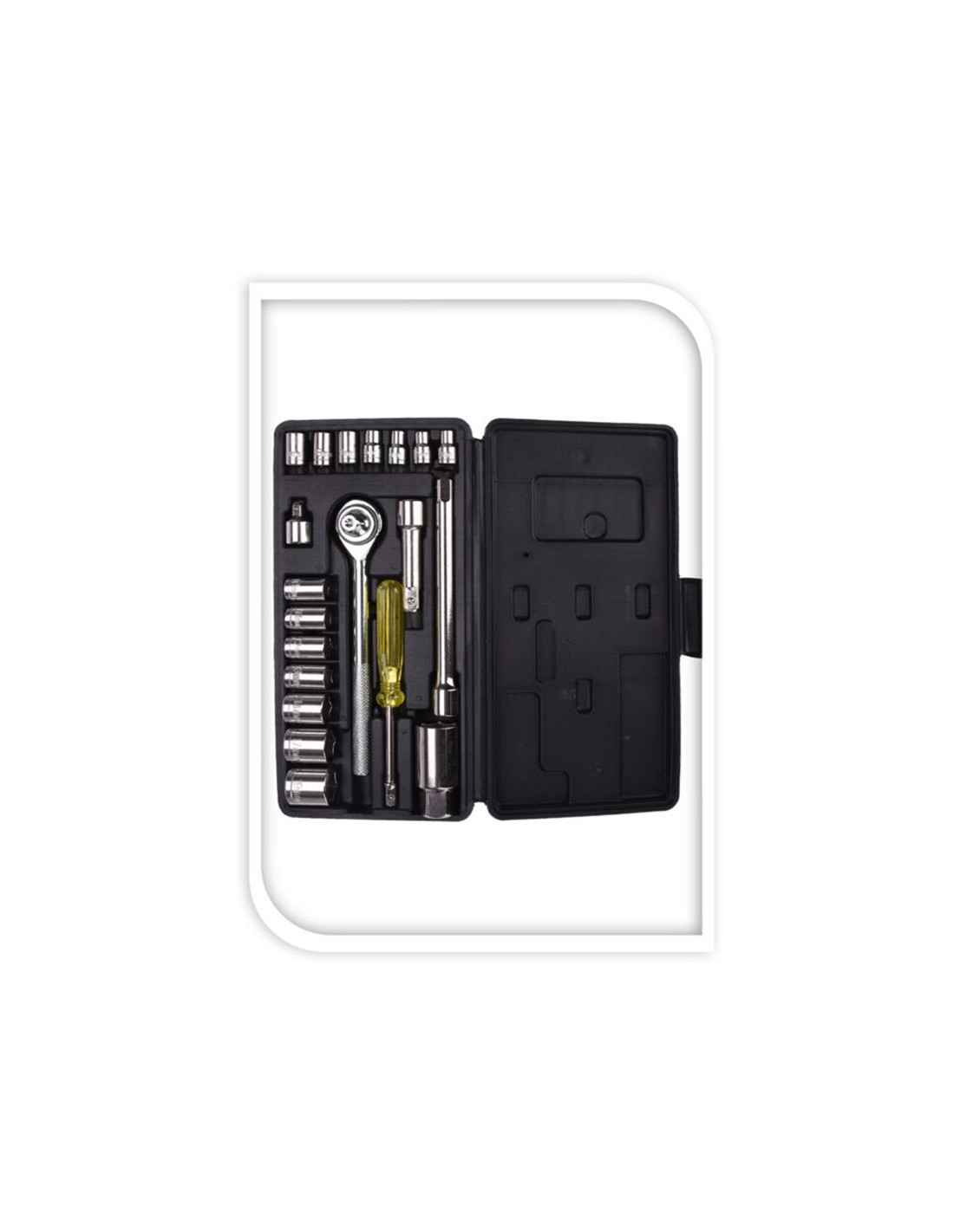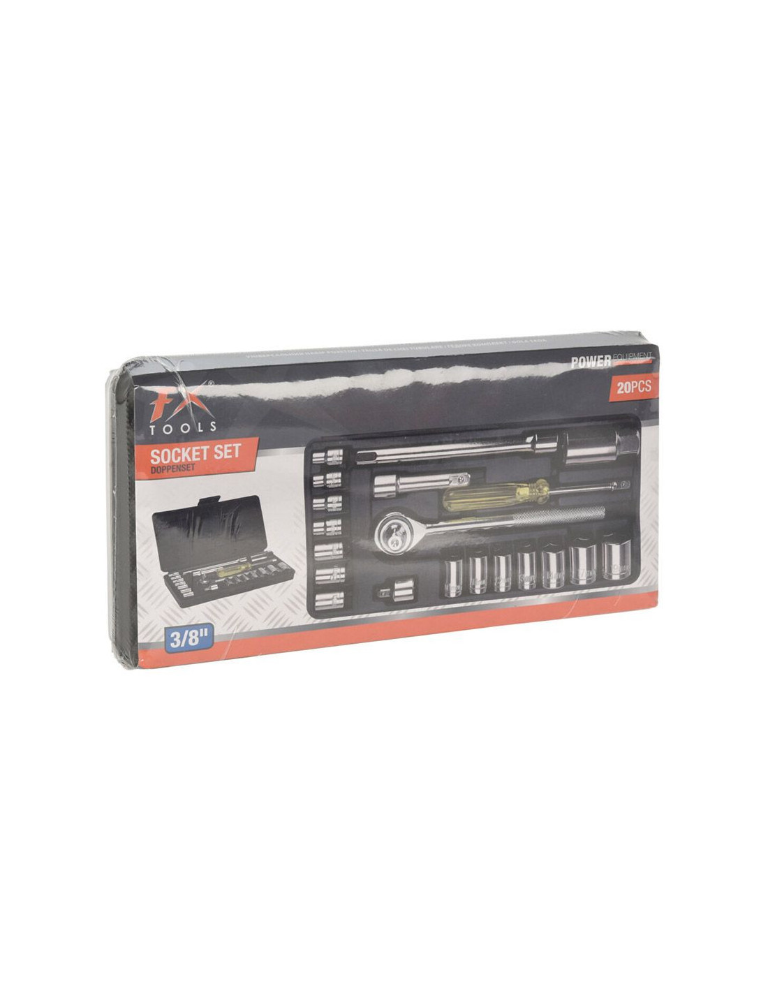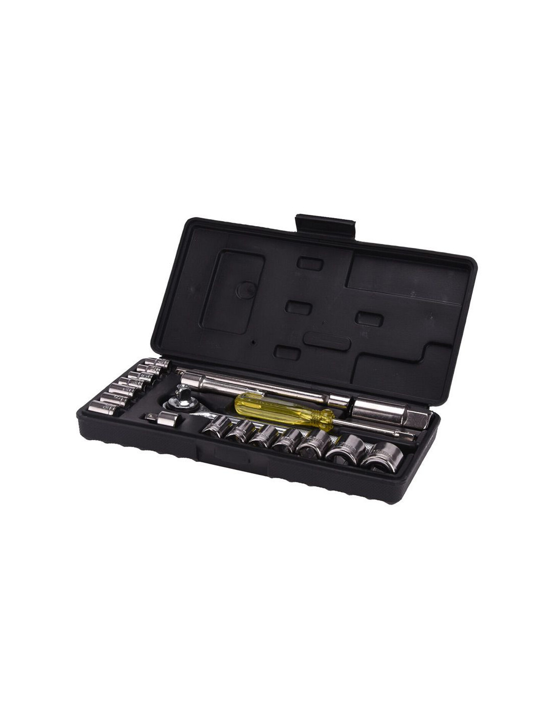 1x schroevendraaier 1/4" 1x verlengstuk 14cm 1x verlengstuk 7cm 1x adapter 3/8" > 1/4" 1x ratel 3/8" 1x 21 bougie aansluiting (13/16") 7x 3/8" aansluitingen: 19, 17, 14, 13, 12, 11, 10mm 7x 1/4" aansluitingen: 9, 8, 7, 6, 5, 4.5, 4mm 1x kunststof opbergbox afmeting box: ca. 25 x 12 x 4.5cm