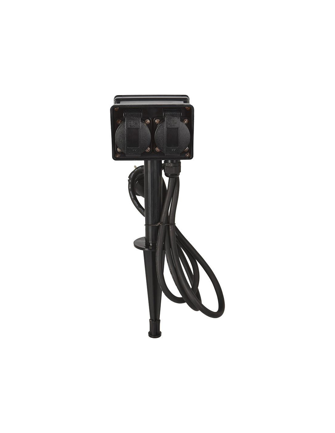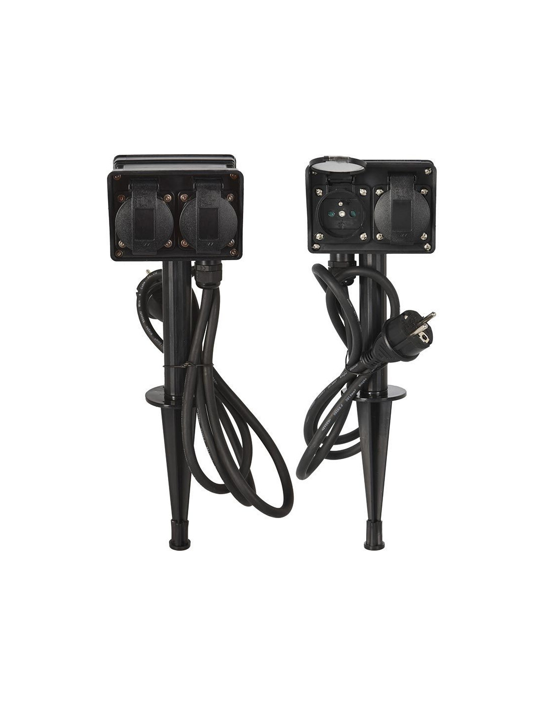 praktische stekkerdoos met grondpen beide zijden hebben 2 stopcontacten, totaal dus 4 stopcontacten voor het aansluiten van o.a. tuinverlichting en kerstverlichting de behuizing en grondpen zijn van weerbestendig kunststof zelfsluitende scharnierende deksels 4-voudig met randaarde met kinderbeveiliging beschermwaarde IP44 max. 3680 Watt 150 cm aansluitsnoer, 1.5mm2 16A, 250V
