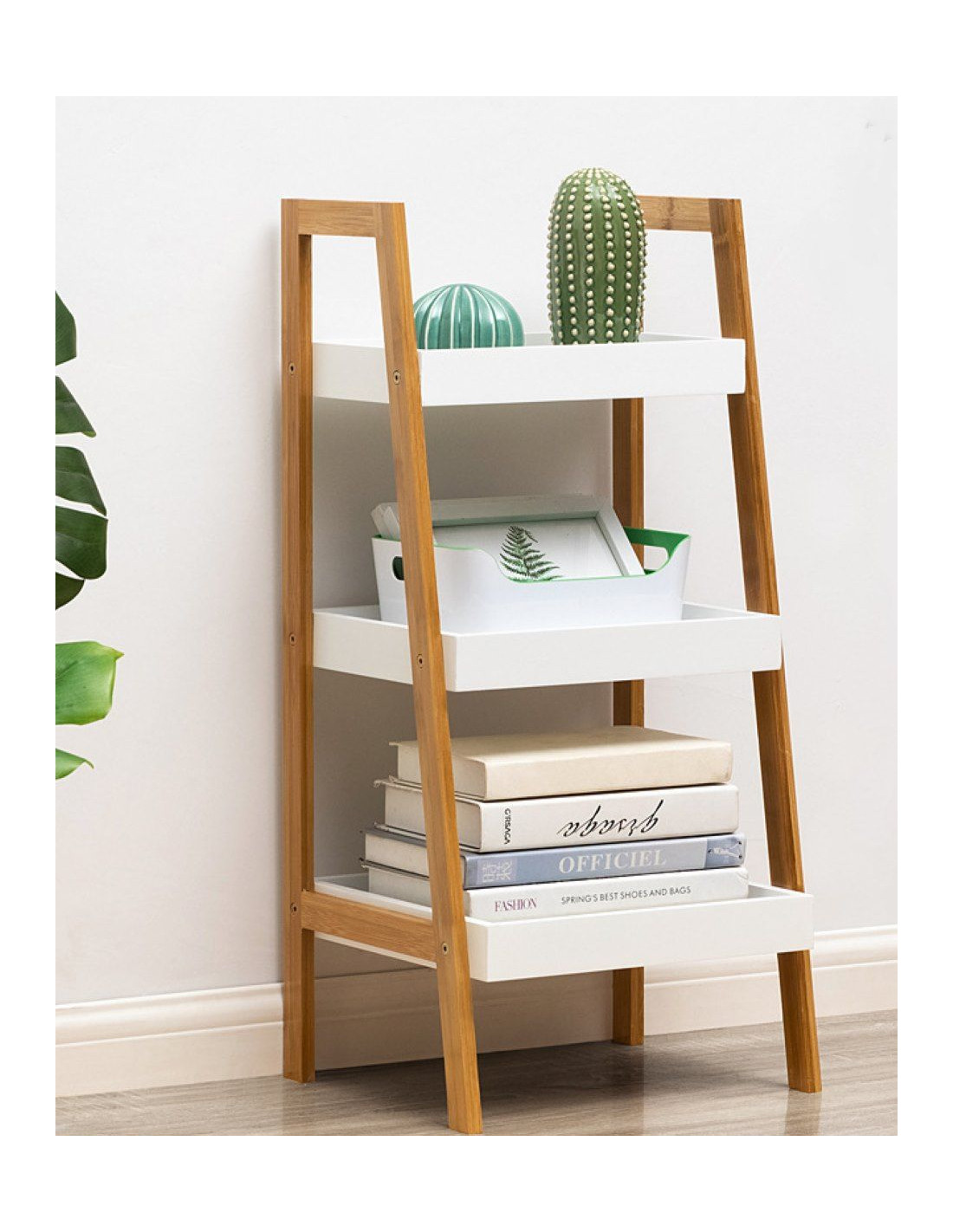 wandkastje met rechte achterzijde en schuine voorzijde 3 witte schappen materiaal: bamboe en MDF afmeting: ca. 32 x 30 x H75 cm montagetijd: 5 minuten met handleiding merk: Ceruzo