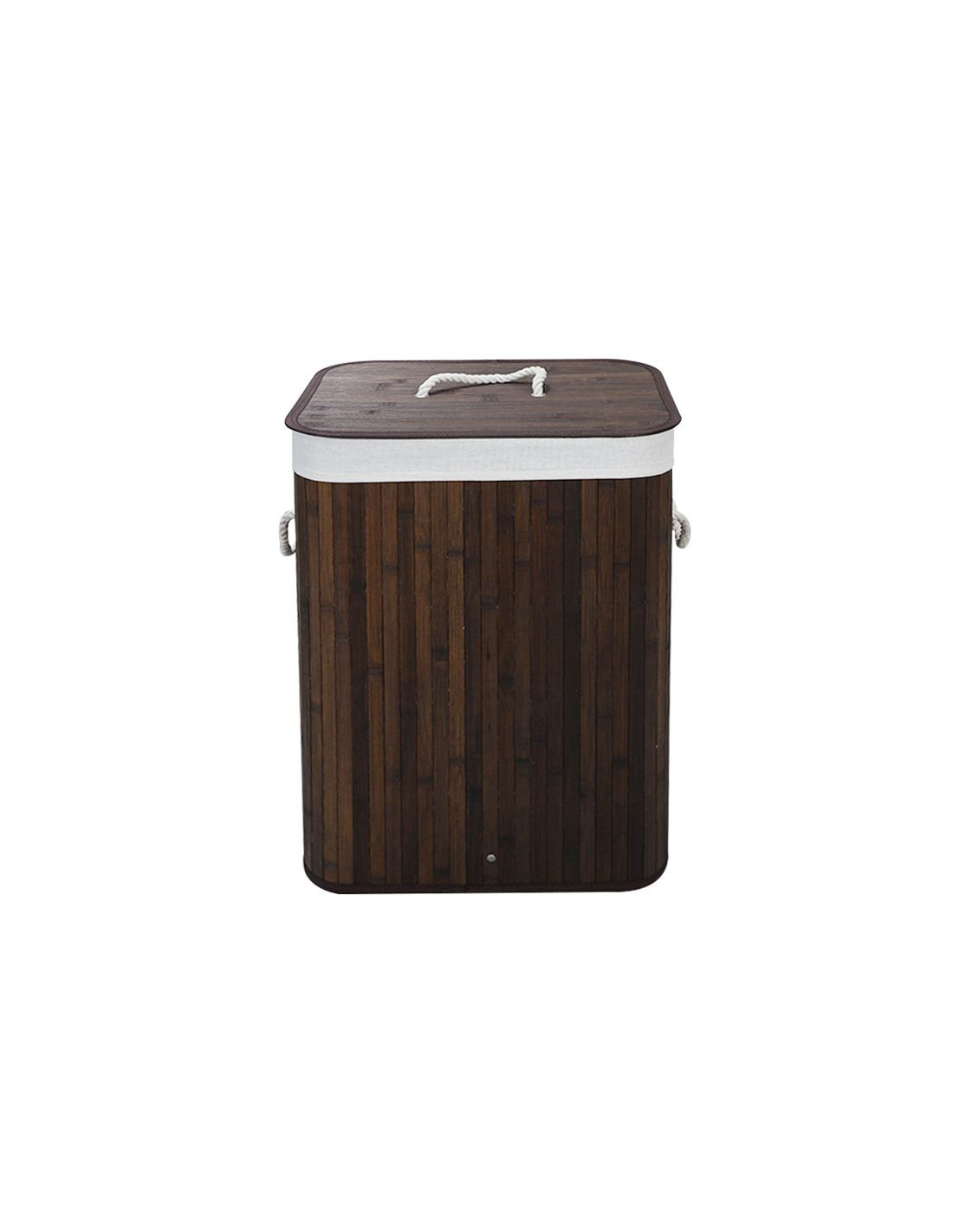 opvouwbaar afmeting: 40 x 30 x H 60 cm capaciteit: 72 liter kleur: bruin afneembaar deksel draaghengsels de metalen ring aan de binnenzijde zorgt voor versteviging en voor een blijvende vorm materiaal binnenzak: 53% polyester, 30% katoen, 17% viscose de uitneembare zak is wasbaar op 30 graden materiaal: bamboe gewicht: 2050 gram merk: Ceruzo