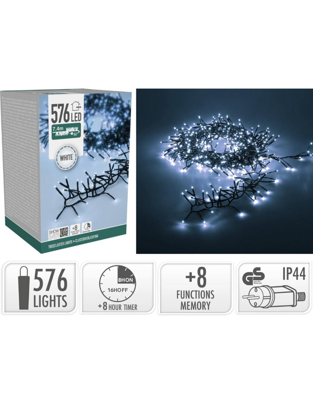 576 led wit, koelwit verlichte lengte: 740 cm aansluitsnoer: 300 cm controller met 8 lichtfuncties geheugen: de laatst gekozen lichtinstelling wordt onthouden automatische timer: 8 uur aan, 16 uur uit zwart snoer lengte takjes: 5 cm IP44 adapter, voor binnen en buiten verbruik: 3.6W