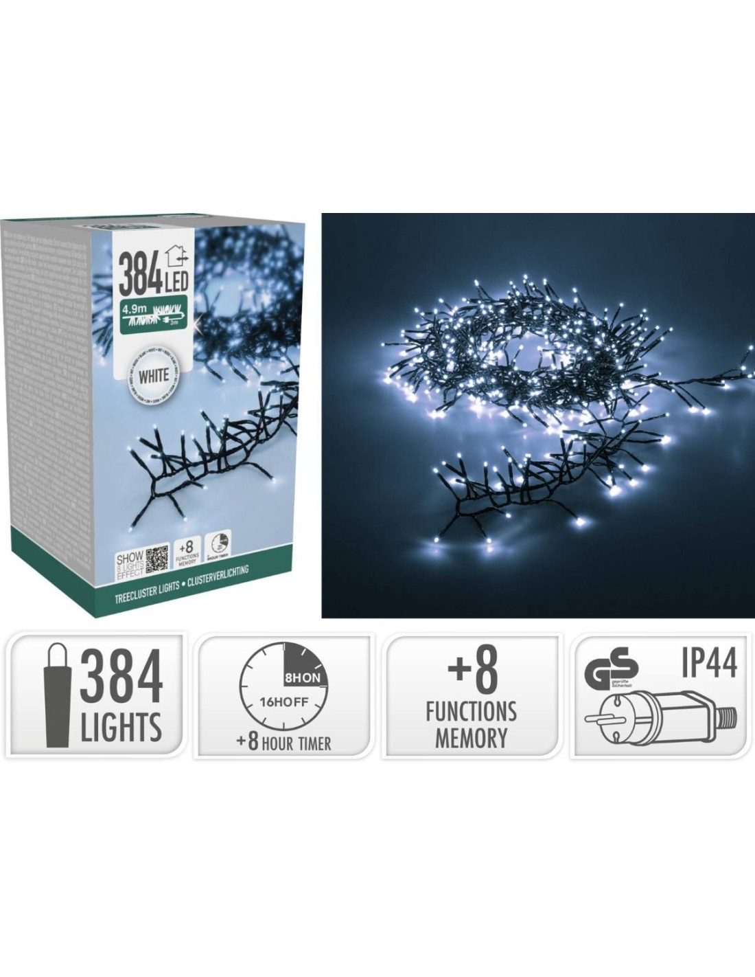 384 led wit, koelwit verlichte lengte: 490 cm aansluitsnoer: 300 cm controller met 8 lichtfuncties geheugen: de laatst gekozen lichtinstelling wordt onthouden automatische timer: 8 uur aan, 16 uur uit zwart snoer lengte takjes: 5 cm IP44 adapter, voor binnen en buiten verbruik: 3.6W