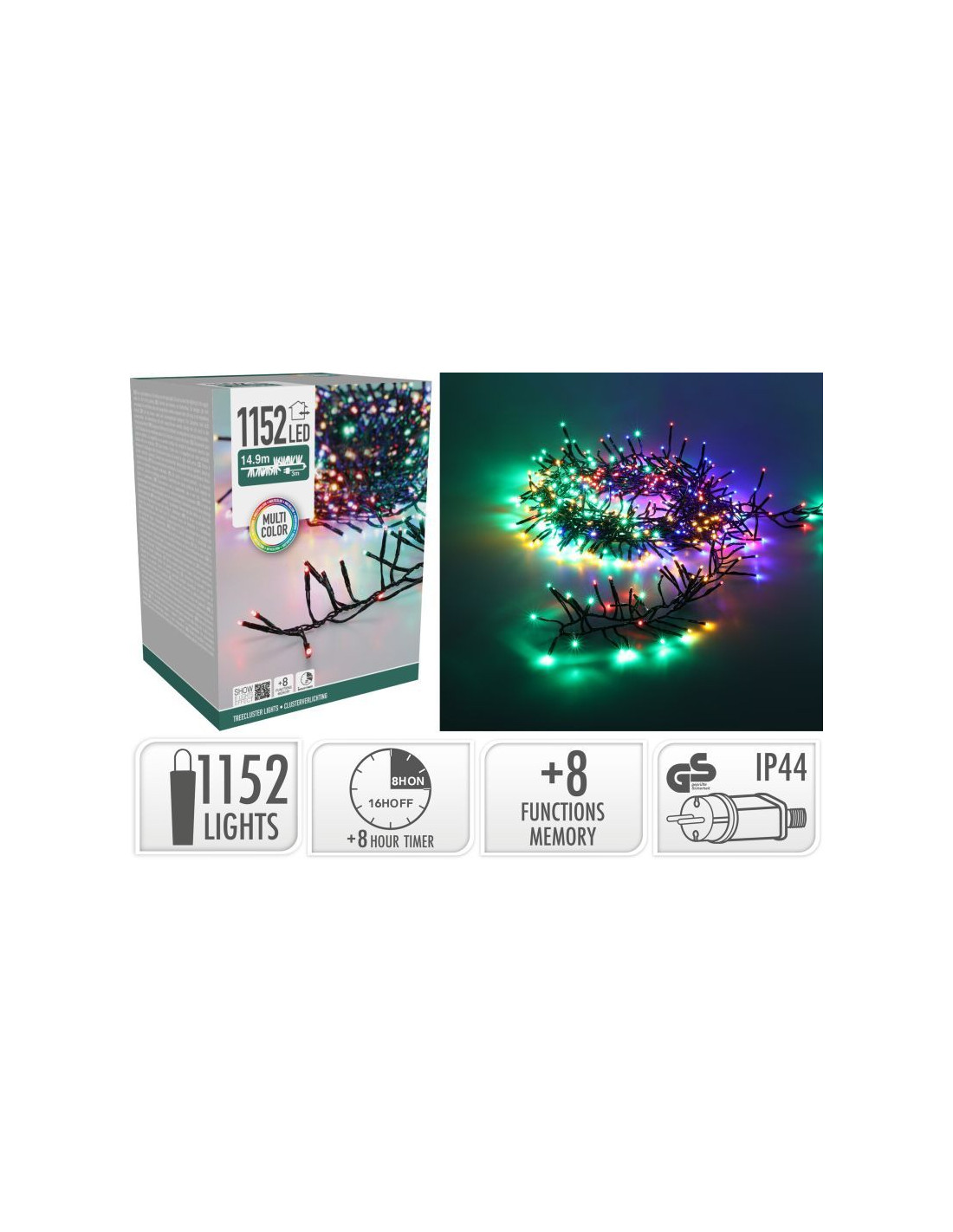 1152 led multicolor, veelkleurig verlichte lengte: 1490 cm aansluitsnoer: 300 cm controller met 8 lichtfuncties geheugen: de laatst gekozen lichtinstelling wordt onthouden automatische timer: 8 uur aan, 16 uur uit zwart snoer lengte takjes: 5 cm IP44 adapter, voor binnen en buiten verbruik: 7.2W