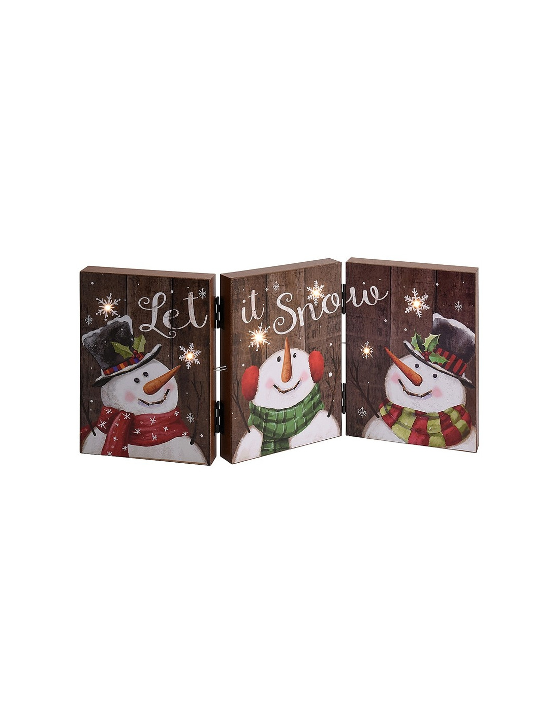 Unieke houten winterdecoratie "Let it snow" drieluik van 45 x 2 x 20 cm, verrijkt met 6 energiezuinige LED-lampjes. Werkt op 2 AA batterijen (exclusief). Perfect voor een sfeervolle winterse uitstraling in elk interieur.
