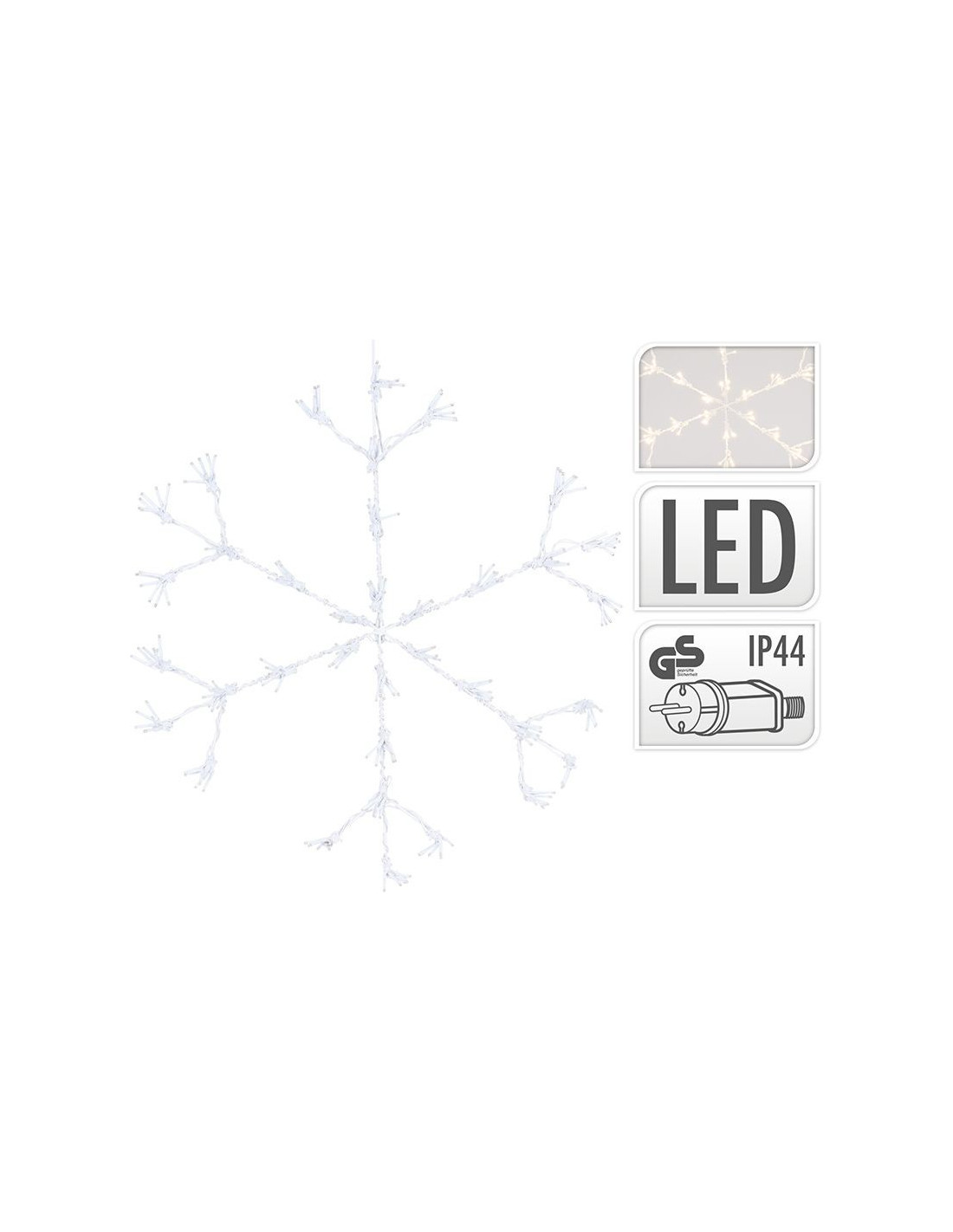 Deze verlichte sneeuwvlok is geschikt om zowel binnen als buiten op te hangen. Het kerstfiguur heeft een diameter van maar liefst 60 cm, waardoor het een echte blikvanger is. De verlichting heeft in totaal 216 warm witte led's: 36 clusters met 6 lampjes, hierdoor krijg je het speelse "firework effect". 250 led (36x6) warm wit Ø60cm aansluitsnoer: 5 meter geschikt voor buiten en binnen (beschermwaarde IP44) gewicht: ca. 1.2 kg