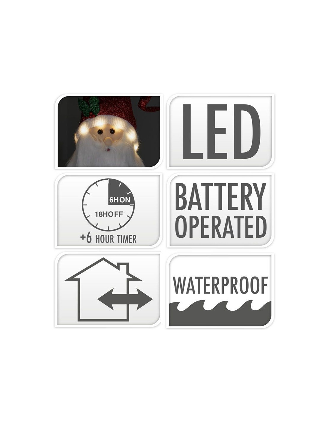 Bovendien beschikt deze kerstman over een timerfunctie. Hij blijft 6 uur aan en schakelt vervolgens automatisch 18 uur uit, zodat u de batterijen optimaal kunt benutten en zich geen zorgen hoeft te maken over het uitschakelen van de lampjes.