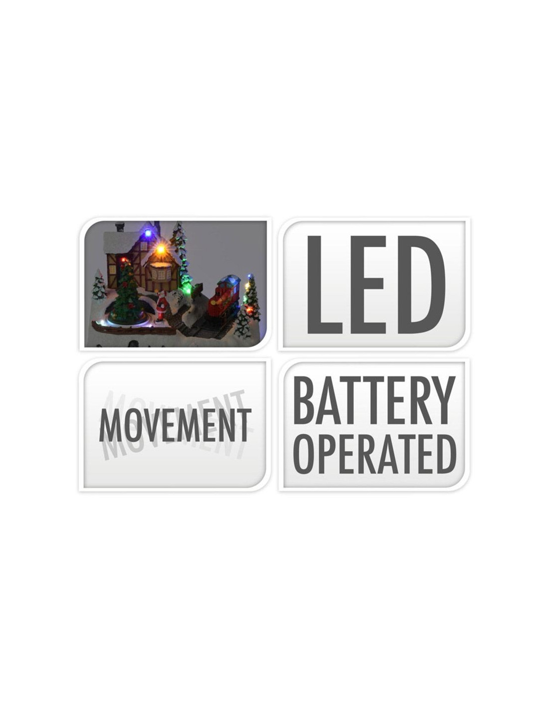 Dit Kersttafereel is eenvoudig in gebruik en werkt op batterijen voor optimale flexibiliteit bij het plaatsen in je huis. Er zijn 10 LED-lampjes in meerdere kleuren die een betoverende verlichting bieden. Daarnaast draait de kerstboom rond en beweegt de trein van voor naar achter, wat een levendig en dynamisch element toevoegt aan het geheel. Om het tafereel tot leven te brengen, heb je 3x AA-batterijen nodig (niet inbegrepen).