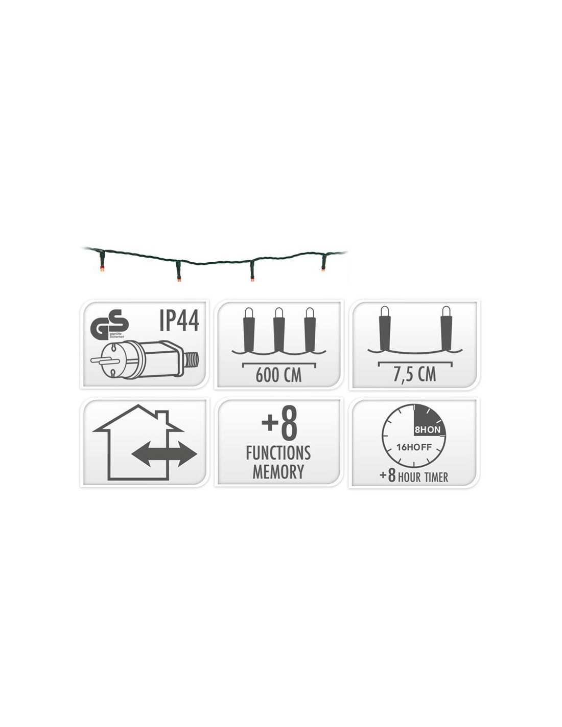 LED Lichtsnoer van 6 meter met 80 lampjes, voor binnen en buiten 80 led's rood 8 lichtfuncties: 1.Combination, 2. In wave, 3.Sequential, 4. Slo glo, 5. Chasing/flash, 6.Slow fade, 7.Twinkle/flash, 8.Steady on geheugen: de laatste gekozen lichtinstelling wordt onthouden timer: 8 uur aan / 16 uur uit verlichte lengte: 600 cm aanloopsnoer: 300 cm groen snoer afstand tussen de takjes: 7.5 cm IP44 adapter: voor binnen en buiten zuinig in verbruik: 1.1W