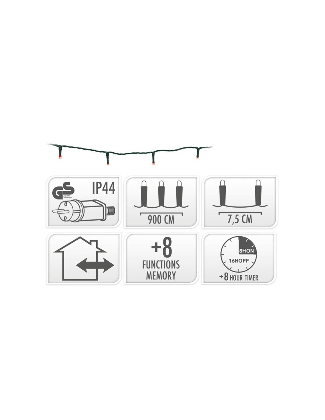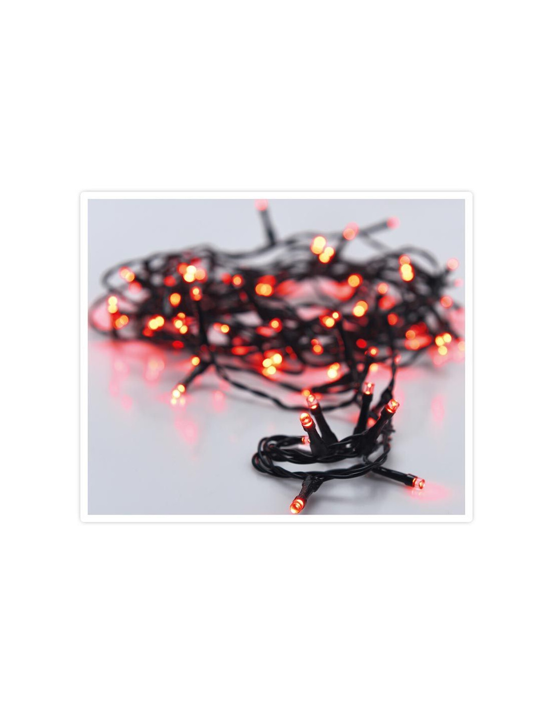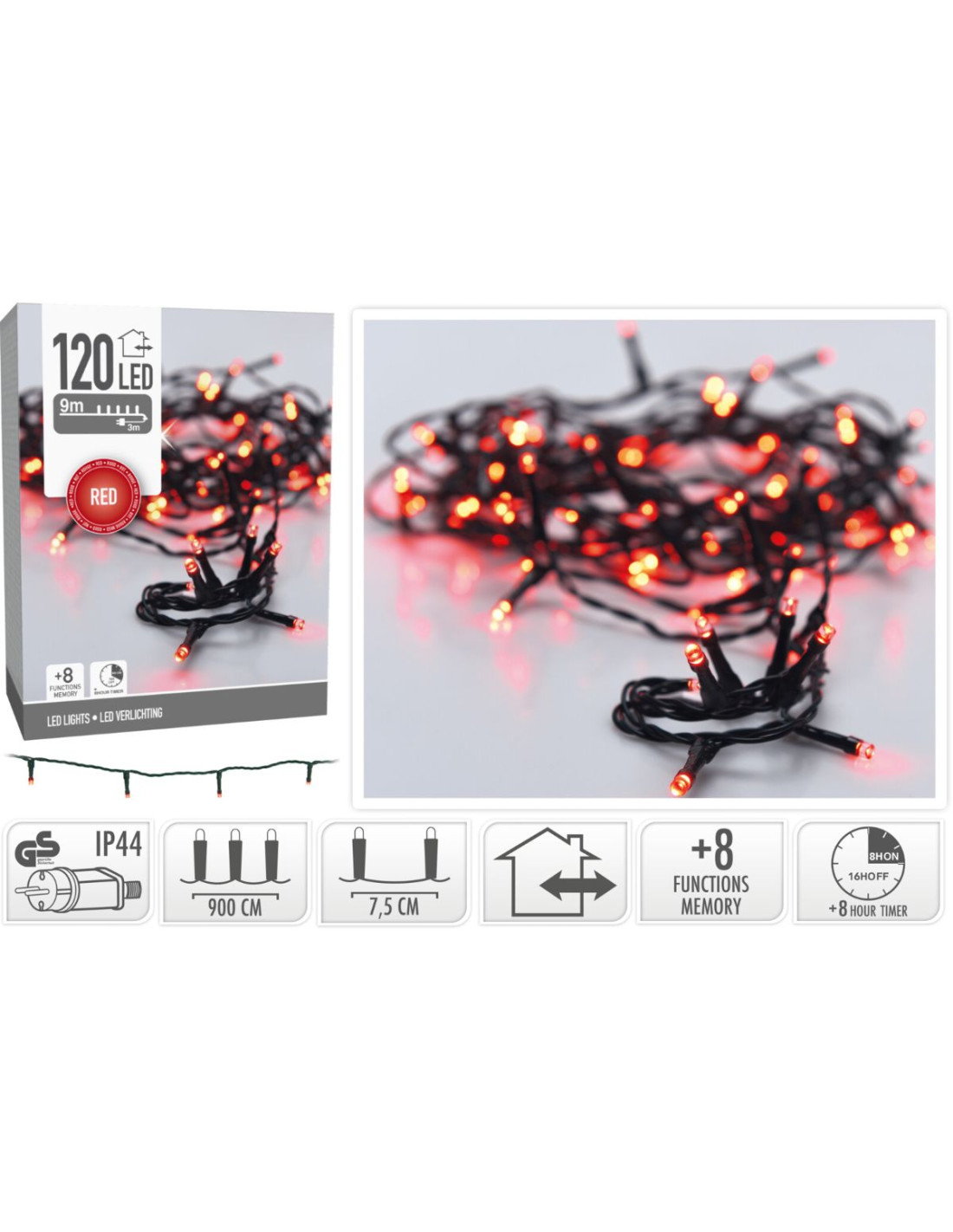 LED Lichtsnoer van 9 meter met 120 lampjes, voor binnen en buiten 120 led's rood 8 lichtfuncties: 1.Combination, 2. In wave, 3.Sequential, 4. Slo glo, 5. Chasing/flash, 6.Slow fade, 7.Twinkle/flash, 8.Steady on geheugen: de laatste gekozen lichtinstelling wordt onthouden timer: 8 uur aan / 16 uur uit verlichte lengte: 900 cm aanloopsnoer: 300 cm groen snoer afstand tussen de takjes: 7.5 cm IP44 adapter: voor binnen en buiten zuinig in verbruik: 3.6W