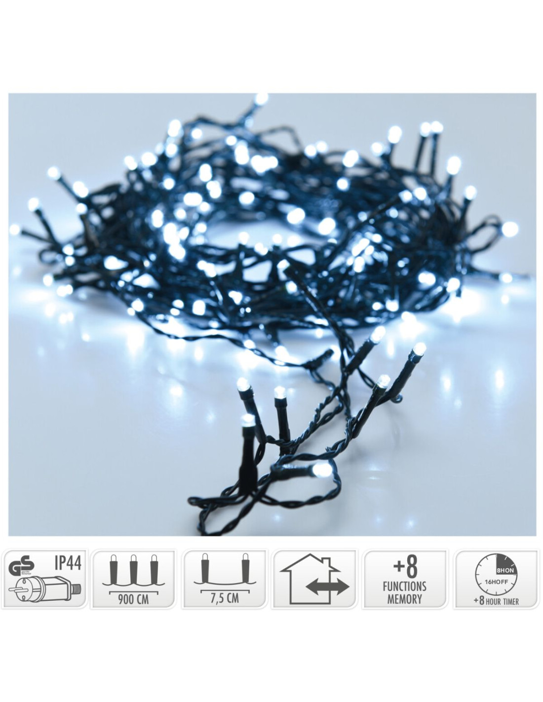 LED Lichtsnoer van 9 meter met 120 lampjes, voor binnen en buiten 120 led's wit (ijswit, energiek, magisch) 8 lichtfuncties: 1.Combination, 2. In wave, 3.Sequential, 4. Slo glo, 5. Chasing/flash, 6.Slow fade, 7.Twinkle/flash, 8.Steady on geheugen: de laatste gekozen lichtinstelling wordt onthouden timer: 8 uur aan / 16 uur uit verlichte lengte: 900 cm aanloopsnoer: 300 cm groen snoer afstand tussen de takjes: 7.5 cm IP44 adapter: voor binnen en buiten zuinig in verbruik: 3.6W