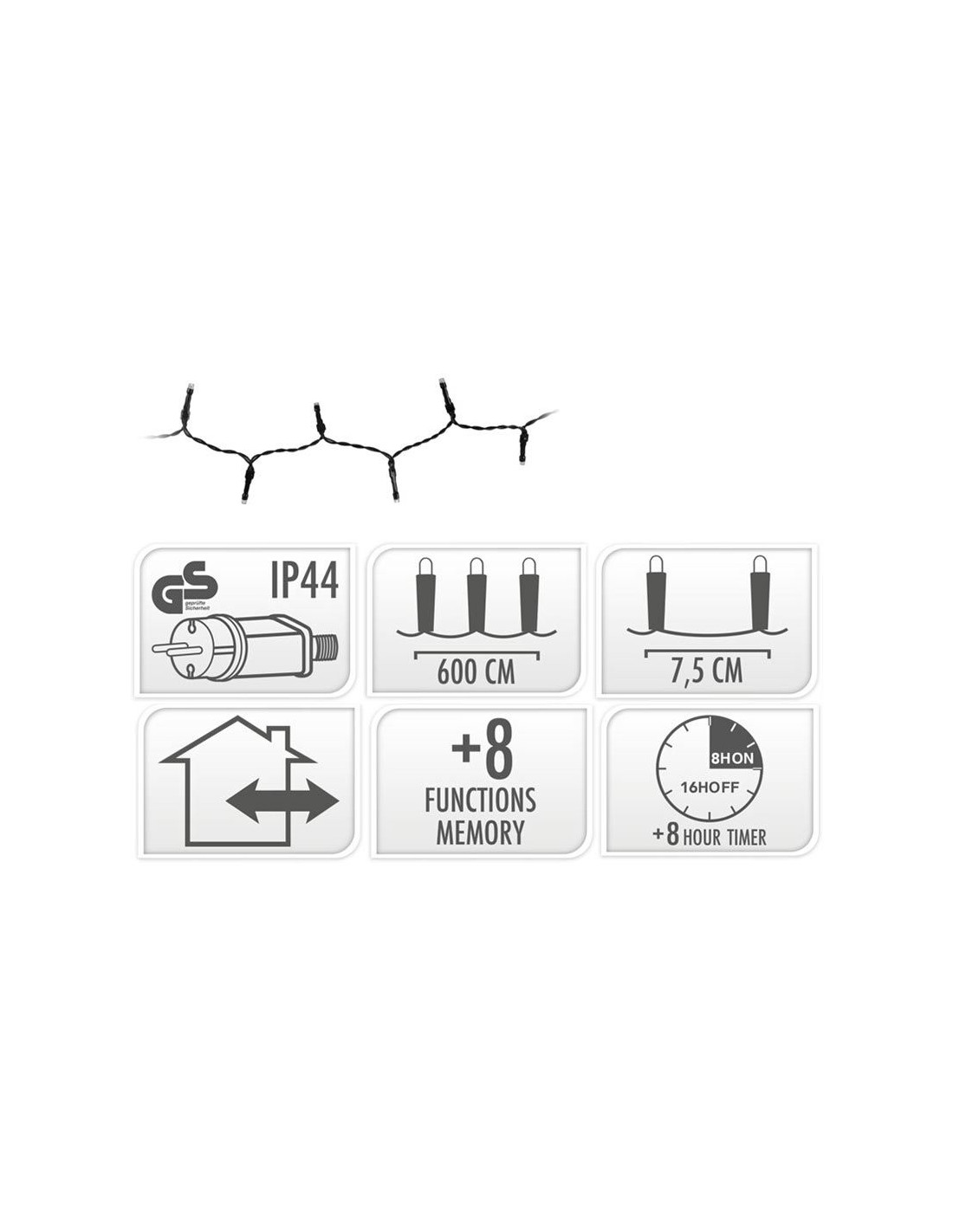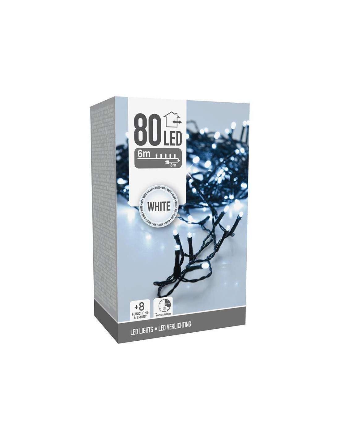 LED Lichtsnoer van 6 meter met 80 lampjes, voor binnen en buiten 80 led's wit (ijswit, energiek, magisch) 8 lichtfuncties: 1.Combination, 2. In wave, 3.Sequential, 4. Slo glo, 5. Chasing/flash, 6.Slow fade, 7.Twinkle/flash, 8.Steady on geheugen: de laatste gekozen lichtinstelling wordt onthouden timer: 8 uur aan / 16 uur uit verlichte lengte: 600 cm aanloopsnoer: 300 cm groen snoer afstand tussen de takjes: 7.5 cm IP44 adapter: voor binnen en buiten zuinig in verbruik: 1.1W