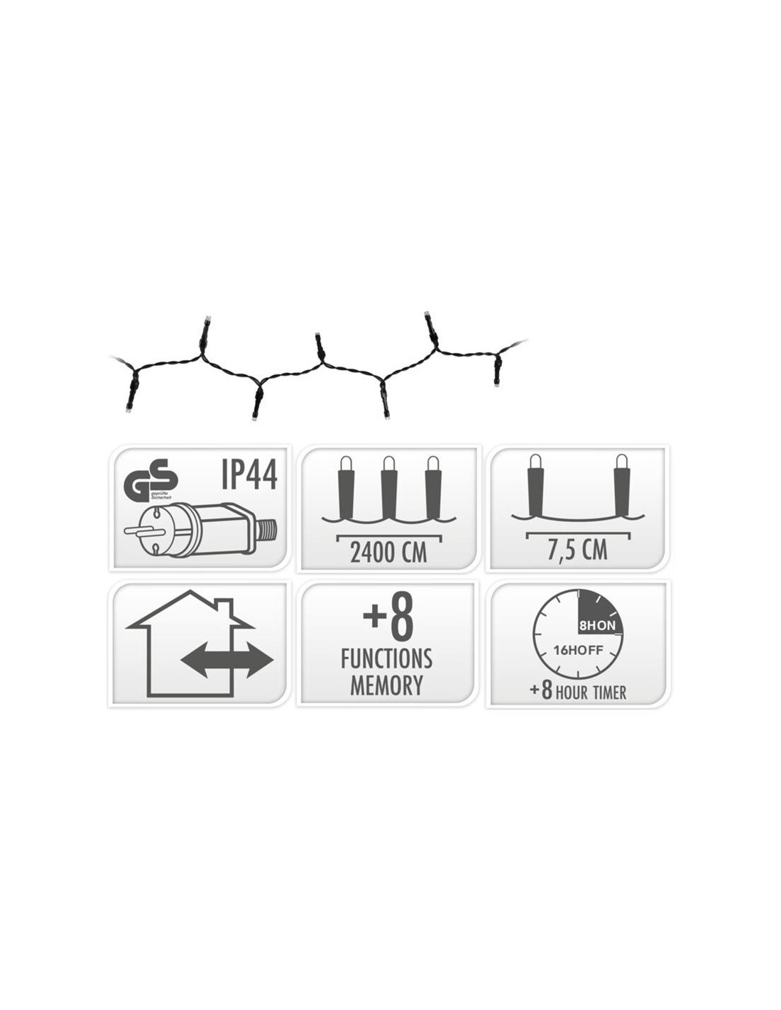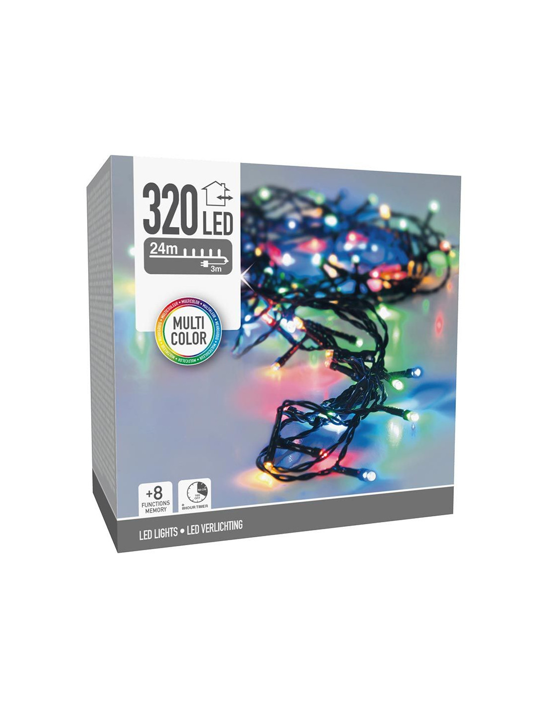 LED Lichtsnoer van 24 meter met 320 lampjes, voor binnen en buiten 320 led's multicolor, veelkleurig 8 lichtfuncties: 1.Combination, 2. In wave, 3.Sequential, 4. Slo glo, 5. Chasing/flash, 6.Slow fade, 7.Twinkle/flash, 8.Steady on geheugen: de laatste gekozen lichtinstelling wordt onthouden timer: 8 uur aan / 16 uur uit verlichte lengte: 2400 cm aanloopsnoer: 300 cm groen snoer afstand tussen de takjes: 7.5 cm IP44 adapter: voor binnen en buiten zuinig in verbruik: 6W