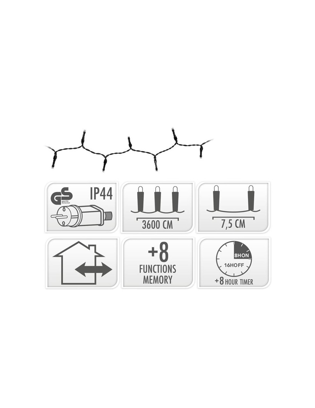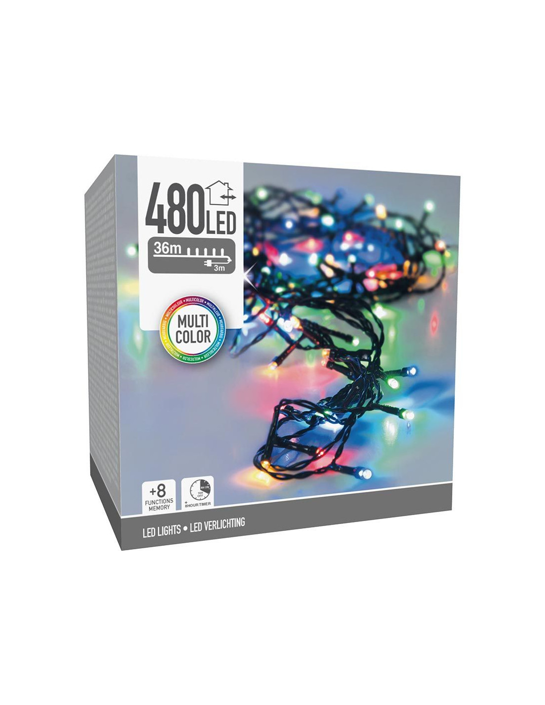 LED Lichtsnoer van 36 meter met 480 lampjes, voor binnen en buiten 480 led's multicolor, veelkleurig 8 lichtfuncties: 1.Combination, 2. In wave, 3.Sequential, 4. Slo glo, 5. Chasing/flash, 6.Slow fade, 7.Twinkle/flash, 8.Steady on geheugen: de laatste gekozen lichtinstelling wordt onthouden timer: 8 uur aan / 16 uur uit verlichte lengte: 3600 cm aanloopsnoer: 300 cm groen snoer afstand tussen de takjes: 7.5 cm IP44 adapter: voor binnen en buiten zuinig in verbruik: 6W
