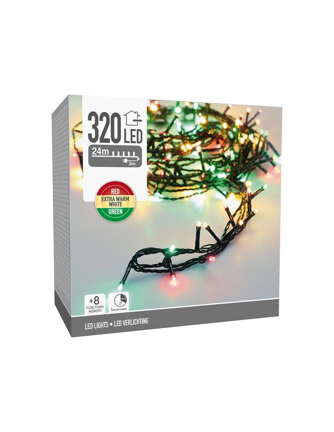 LED Lichtsnoer van 9 meter met 120 lampjes, voor binnen en buiten 120 led's 3 kleuren: rood + extra warm wit + groen 8 lichtfuncties: 1.Combination, 2. In wave, 3.Sequential, 4. Slo glo, 5. Chasing/flash, 6.Slow fade, 7.Twinkle/flash, 8.Steady on geheugen: de laatste gekozen lichtinstelling wordt onthouden timer: 8 uur aan / 16 uur uit verlichte lengte: 900 cm aanloopsnoer: 300 cm groen snoer afstand tussen de takjes: 7.5 cm IP44 adapter: voor binnen en buiten zuinig in verbruik: 3.6W