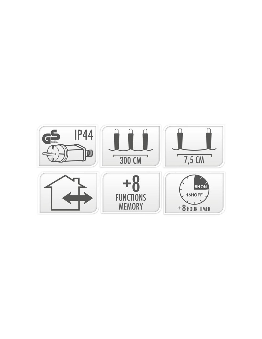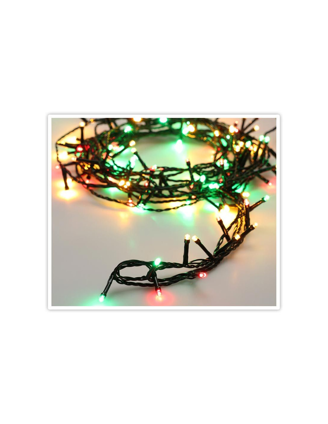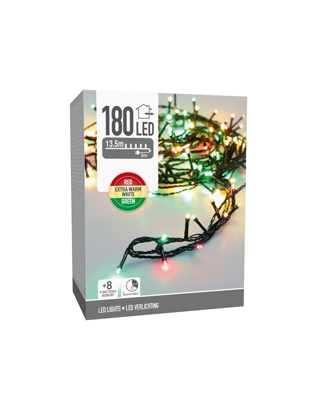 LED Lichtsnoer van 13.5 meter met 180 lampjes, voor binnen en buiten 180 led's 3 kleuren: rood + extra warm wit + groen 8 lichtfuncties: 1.Combination, 2. In wave, 3.Sequential, 4. Slo glo, 5. Chasing/flash, 6.Slow fade, 7.Twinkle/flash, 8.Steady on geheugen: de laatste gekozen lichtinstelling wordt onthouden timer: 8 uur aan / 16 uur uit verlichte lengte: 1350 cm aanloopsnoer: 300 cm groen snoer afstand tussen de takjes: 7.5 cm IP44 adapter: voor binnen en buiten zuinig in verbruik: 3.6W