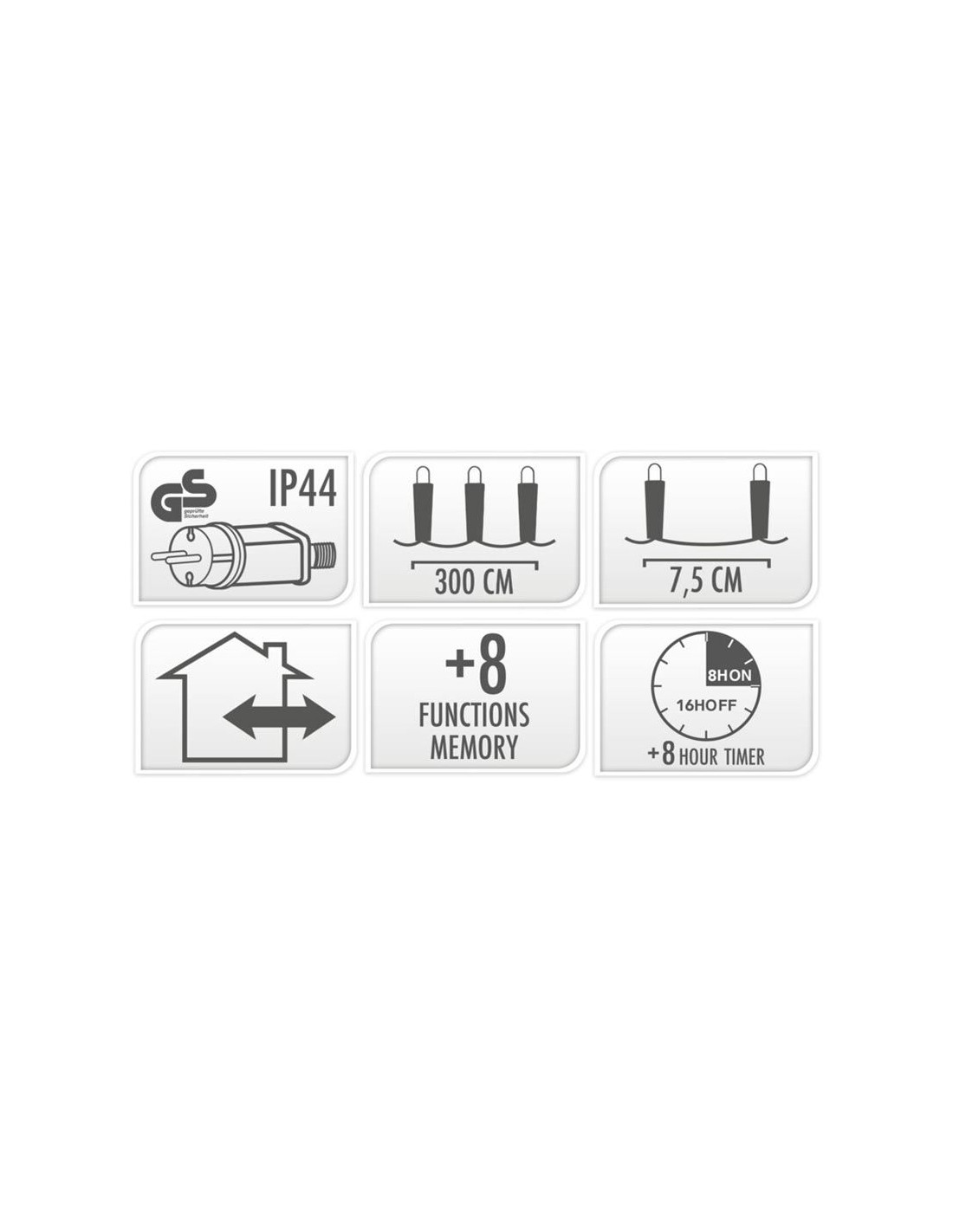 LED Lichtsnoer van 24 meter met 320 lampjes, voor binnen en buiten 320 led's 3 kleuren: rood + extra warm wit + groen 8 lichtfuncties: 1.Combination, 2. In wave, 3.Sequential, 4. Slo glo, 5. Chasing/flash, 6.Slow fade, 7.Twinkle/flash, 8.Steady on geheugen: de laatste gekozen lichtinstelling wordt onthouden timer: 8 uur aan / 16 uur uit verlichte lengte: 2400 cm aanloopsnoer: 300 cm groen snoer afstand tussen de takjes: 7.5 cm IP44 adapter: voor binnen en buiten zuinig in verbruik: 6W