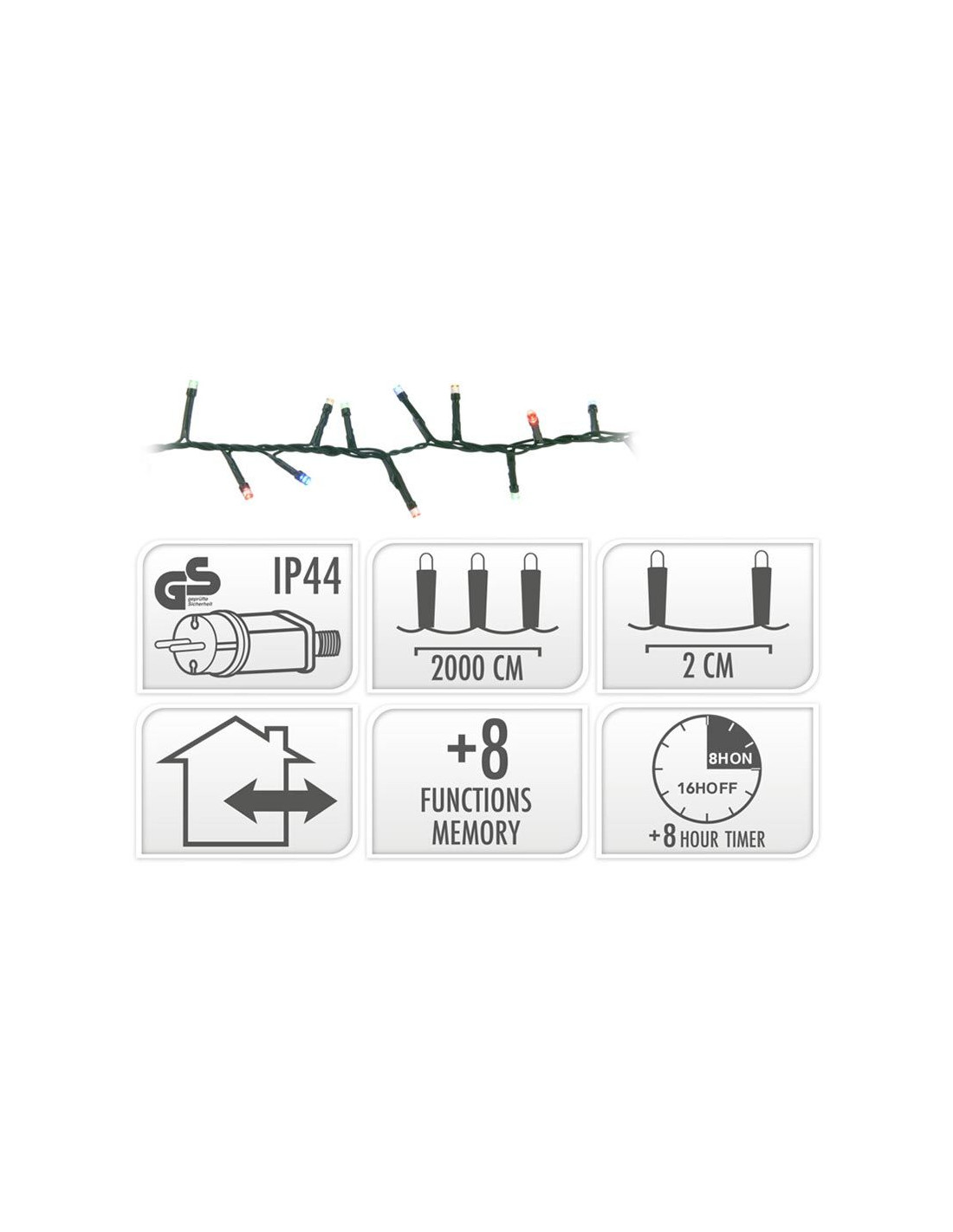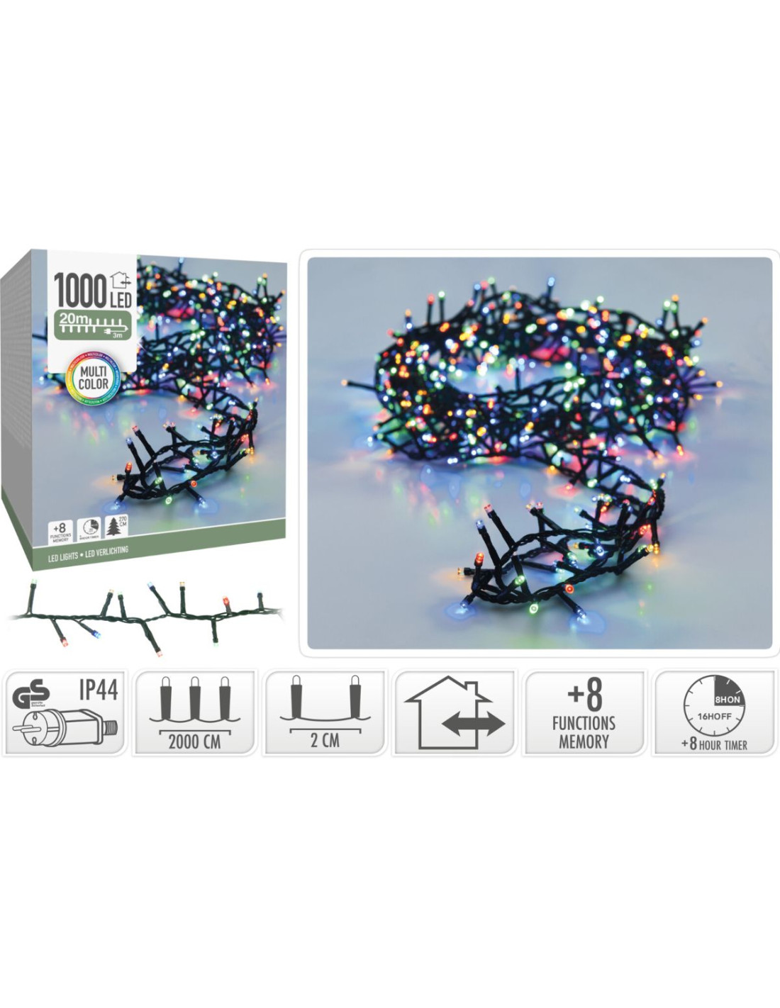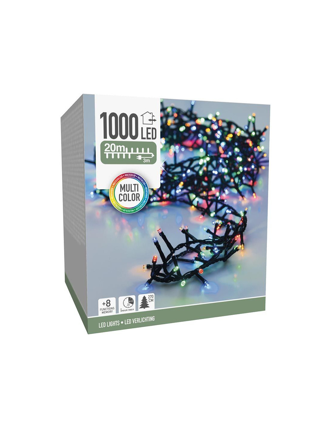 Kerstverlichting van 20 meter met 1000 LED lampjes, geschikt voor een kerstboom van 270 cm, voor binnen en buiten gebruik 1000 led's multicolor, veelkleurig 8 lichtfuncties: 1.Combination, 2. In waves, 3.Sequential, 4. Slo glo, 5. Chasing/flash, 6.Slow fade, 7.Twinkle/flash, 8.Steady on geheugen: de laatste gekozen lichtinstelling wordt onthouden timer: 8 uur aan / 16 uur uit verlichte lengte: 2000 cm aanloopsnoer: 300 cm groen snoer lengte takjes: 3 cm afstand tussen de takjes: 2 cm IP44 adapter: voor binnen en buiten zuinig in verbruik: 6W
