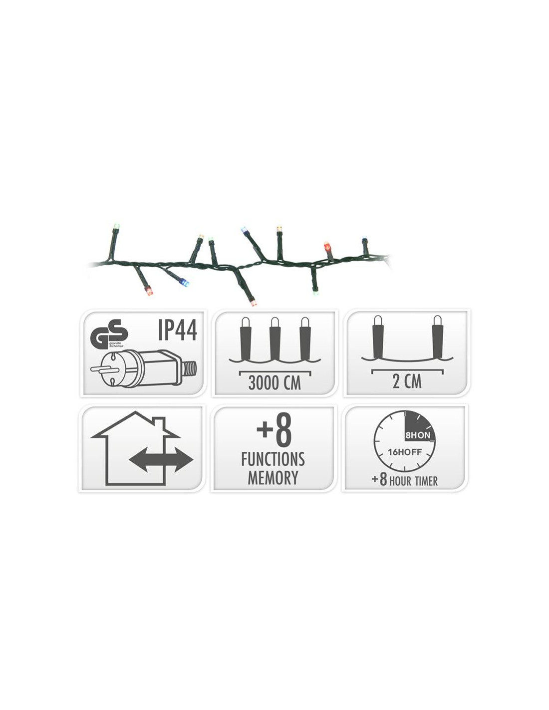 Kerstverlichting van 36 meter met 1800 LED lampjes, geschikt voor een kerstboom van 360 cm, voor binnen en buiten gebruik 1800 led's multicolor, veelkleurig 8 lichtfuncties: 1.Combination, 2. In waves, 3.Sequential, 4. Slo glo, 5. Chasing/flash, 6.Slow fade, 7.Twinkle/flash, 8.Steady on geheugen: de laatste gekozen lichtinstelling wordt onthouden timer: 8 uur aan / 16 uur uit verlichte lengte: 3600 cm aanloopsnoer: 300 cm groen snoer lengte takjes: 3 cm afstand tussen de takjes: 2 cm IP44 adapter: voor binnen en buiten zuinig in verbruik: 9W