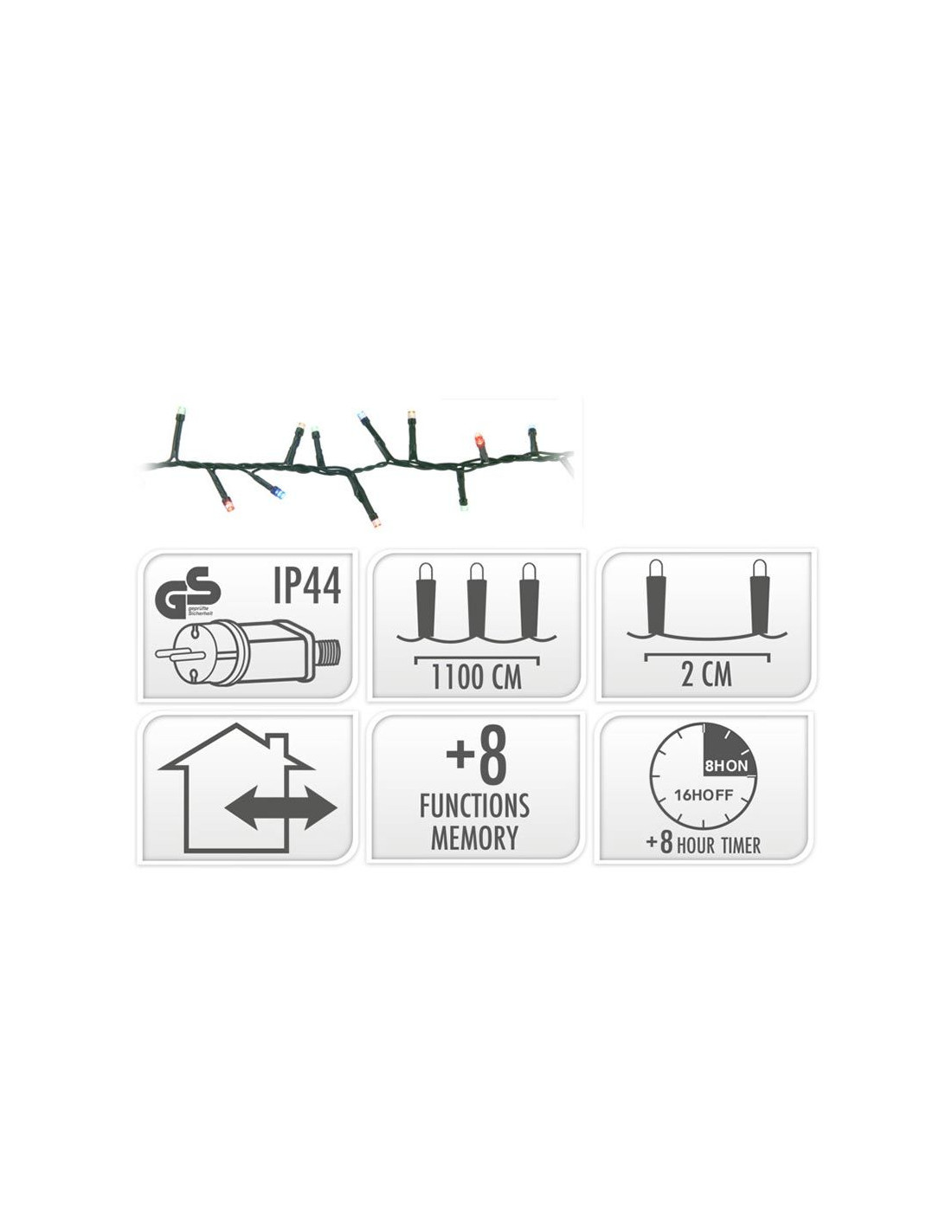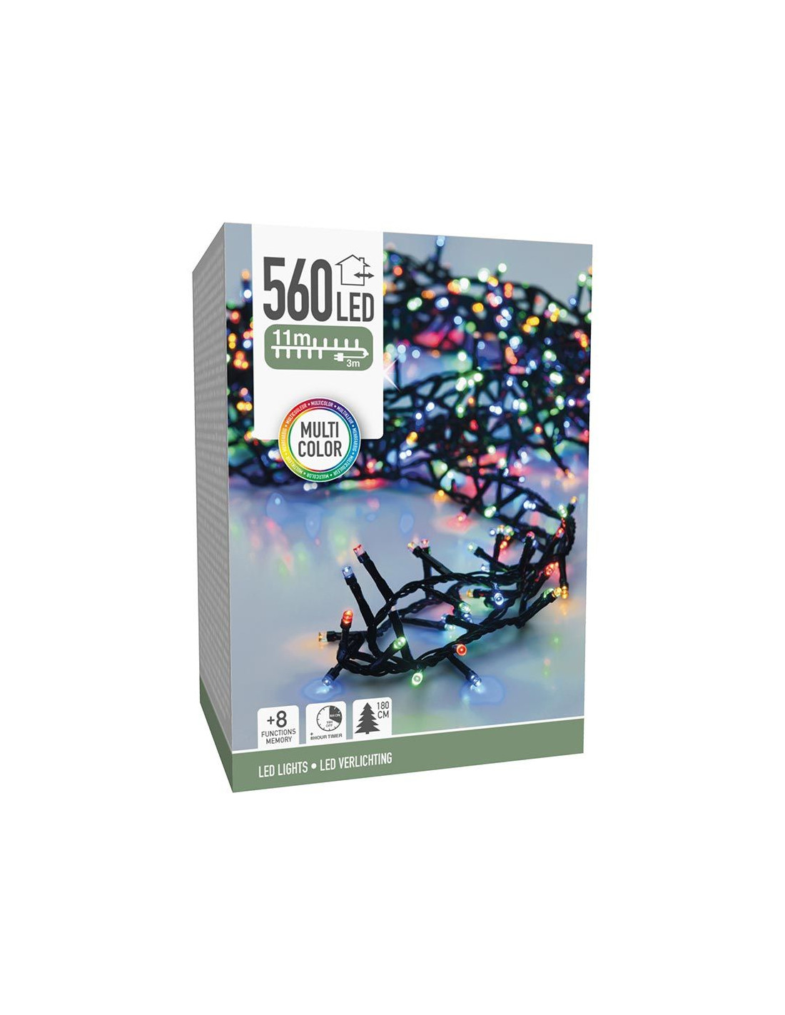 Kerstverlichting van 11 meter met 560 LED lampjes, geschikt voor een kerstboom van 180 cm, voor binnen en buiten gebruik 560 led's multicolor, veelkleurig 8 lichtfuncties: 1.Combination, 2. In waves, 3.Sequential, 4. Slo glo, 5. Chasing/flash, 6.Slow fade, 7.Twinkle/flash, 8.Steady on geheugen: de laatste gekozen lichtinstelling wordt onthouden timer: 8 uur aan / 16 uur uit verlichte lengte: 1120 cm aanloopsnoer: 300 cm groen snoer lengte takjes: 3 cm afstand tussen de takjes: 2 cm IP44 adapter: voor binnen en buiten zuinig in verbruik: 3.6W