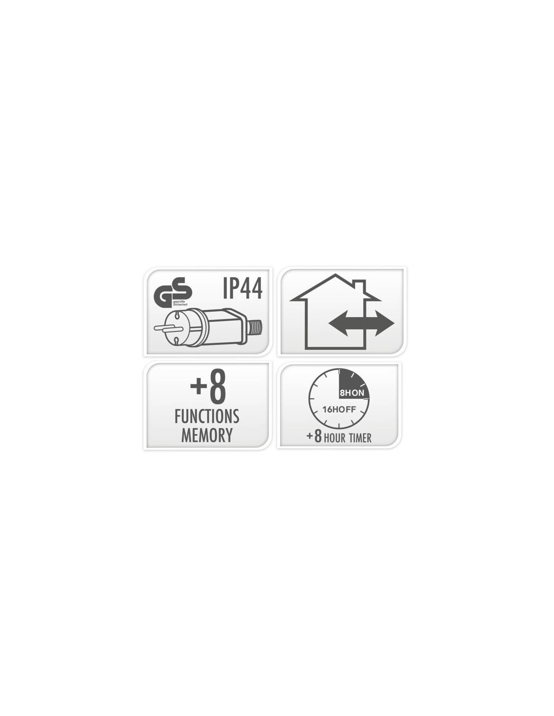 Kerstverlichting 8 meter met 400 LED lampjes, geschikt voor een kerstboom van 150 cm, voor binnen en buiten gebruik 400 led's extra warm wit (klassiek, zacht, romantisch) 8 lichtfuncties: 1.Combination, 2. In waves, 3.Sequential, 4. Slo glo, 5. Chasing/flash, 6.Slow fade, 7.Twinkle/flash, 8.Steady on geheugen: de laatste gekozen lichtinstelling wordt onthouden timer: 8 uur aan / 16 uur uit verlichte lengte: 800 cm aanloopsnoer: 300 cm groen snoer lengte takjes: 3 cm afstand tussen de takjes: 2 cm IP44 adapter: voor binnen en buiten zuinig in verbruik: 3.6W