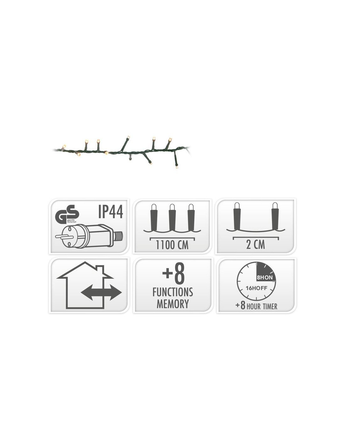Kerstverlichting van 11 meter met 560 LED lampjes, geschikt voor een kerstboom van 180 cm, voor binnen en buiten gebruik 560 led's extra warm wit (klassiek, zacht, romantisch) 8 lichtfuncties: 1.Combination, 2. In waves, 3.Sequential, 4. Slo glo, 5. Chasing/flash, 6.Slow fade, 7.Twinkle/flash, 8.Steady on geheugen: de laatste gekozen lichtinstelling wordt onthouden timer: 8 uur aan / 16 uur uit verlichte lengte: 1120 cm aanloopsnoer: 300 cm groen snoer lengte takjes: 3 cm afstand tussen de takjes: 2 cm IP44 adapter: voor binnen en buiten zuinig in verbruik: 3.6W