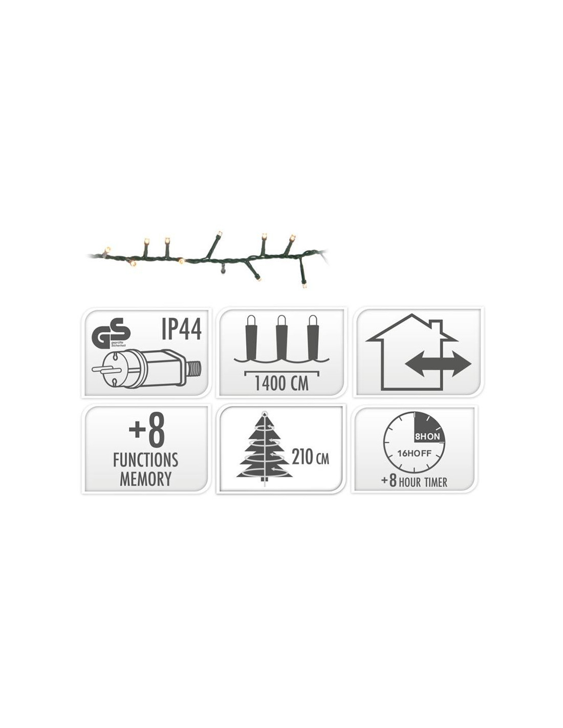 Kerstverlichting van 14 meter met 700 LED lampjes, geschikt voor een kerstboom van 210 cm, voor binnen en buiten gebruik 700 led's extra warm wit (klassiek, zacht, romantisch) 8 lichtfuncties: 1.Combination, 2. In waves, 3.Sequential, 4. Slo glo, 5. Chasing/flash, 6.Slow fade, 7.Twinkle/flash, 8.Steady on geheugen: de laatste gekozen lichtinstelling wordt onthouden timer: 8 uur aan / 16 uur uit verlichte lengte: 1400 cm aanloopsnoer: 300 cm groen snoer lengte takjes: 3 cm afstand tussen de takjes: 2 cm IP44 adapter: voor binnen en buiten zuinig in verbruik: 3.6W