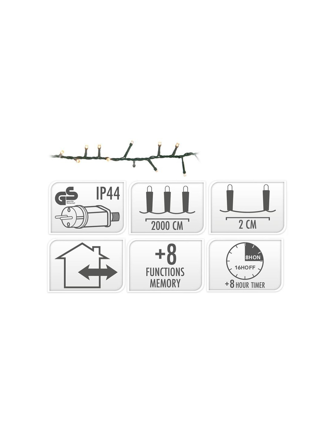 Kerstverlichting van 20 meter met 1000 LED lampjes, geschikt voor een kerstboom van 270 cm, voor binnen en buiten gebruik 1000 led's extra warm wit (klassiek, zacht, romantisch) 8 lichtfuncties: 1.Combination, 2. In waves, 3.Sequential, 4. Slo glo, 5. Chasing/flash, 6.Slow fade, 7.Twinkle/flash, 8.Steady on geheugen: de laatste gekozen lichtinstelling wordt onthouden timer: 8 uur aan / 16 uur uit verlichte lengte: 2000 cm aanloopsnoer: 300 cm groen snoer lengte takjes: 3 cm afstand tussen de takjes: 2 cm IP44 adapter: voor binnen en buiten zuinig in verbruik: 6W