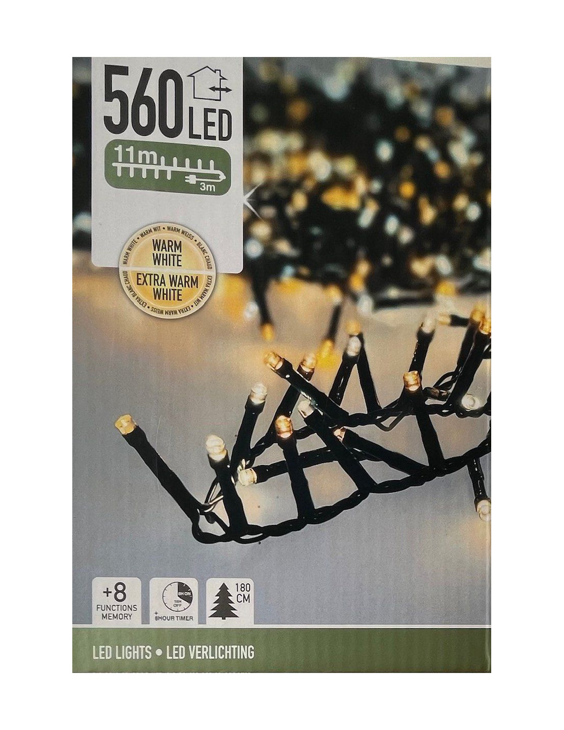 Kerstverlichting van 11 meter met 560 LED lampjes, geschikt voor een kerstboom van 180 cm, voor binnen en buiten gebruik 560 led's 2 kleuren: warm wit + extra warm wit 8 lichtfuncties: 1.Combination, 2. In waves, 3.Sequential, 4. Slo glo, 5. Chasing/flash, 6.Slow fade, 7.Twinkle/flash, 8.Steady on geheugen: de laatste gekozen lichtinstelling wordt onthouden timer: 8 uur aan / 16 uur uit verlichte lengte: 1120 cm aanloopsnoer: 300 cm groen snoer lengte takjes: 3 cm afstand tussen de takjes: 2 cm IP44 adapter: voor binnen en buiten verbruik: 3.6W