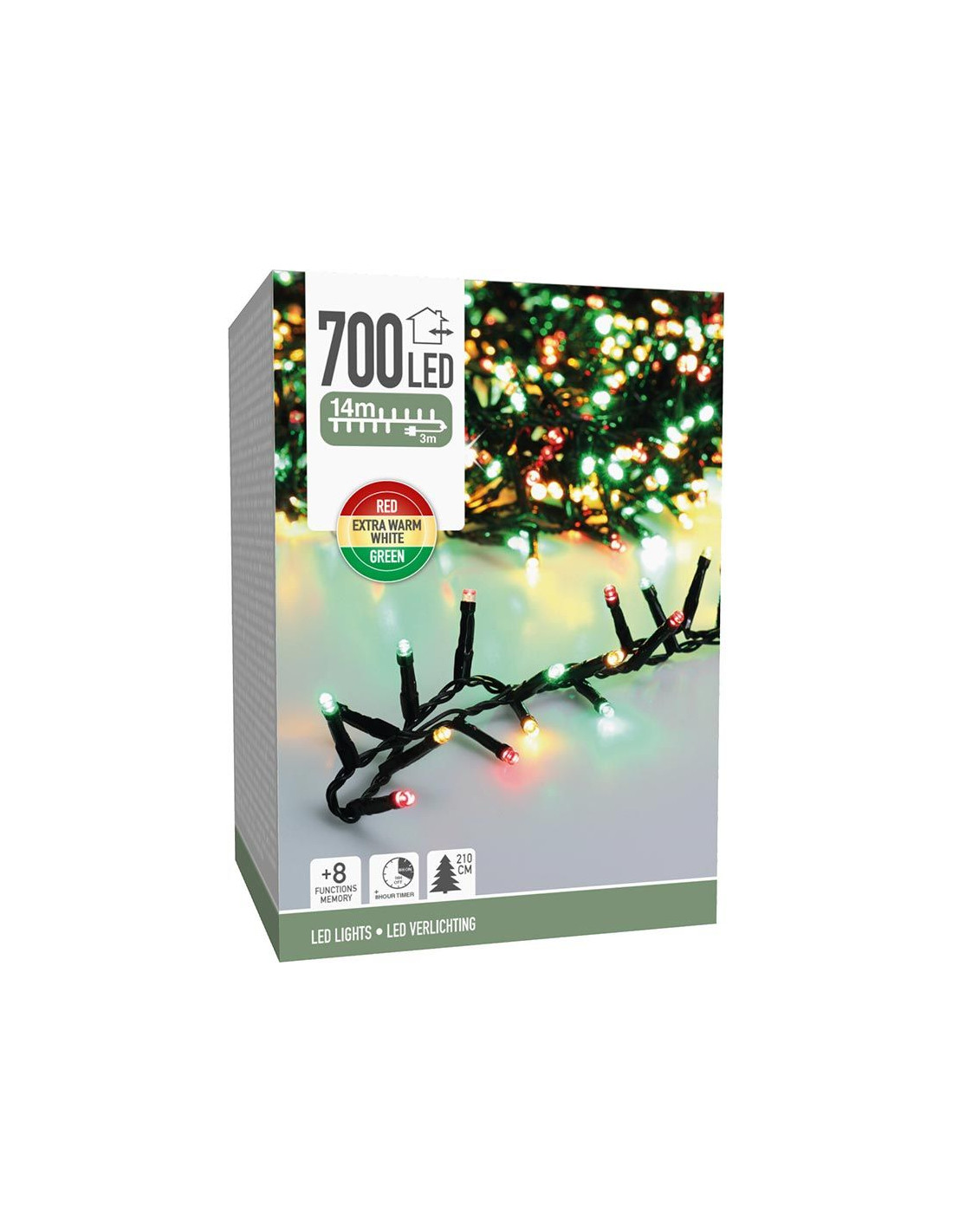 Kerstverlichting van 14 meter met 700 LED lampjes, geschikt voor een kerstboom van 210 cm, voor binnen en buiten gebruik 700 led's 3 kleuren: rood + extra warm wit + groen 8 lichtfuncties: 1.Combination, 2. In waves, 3.Sequential, 4. Slo glo, 5. Chasing/flash, 6.Slow fade, 7.Twinkle/flash, 8.Steady on geheugen: de laatste gekozen lichtinstelling wordt onthouden timer: 8 uur aan / 16 uur uit verlichte lengte: 1400 cm aanloopsnoer: 300 cm groen snoer lengte takjes: 3 cm afstand tussen de takjes: 2 cm IP44 adapter: voor binnen en buiten zuinig in verbruik: 3.6W