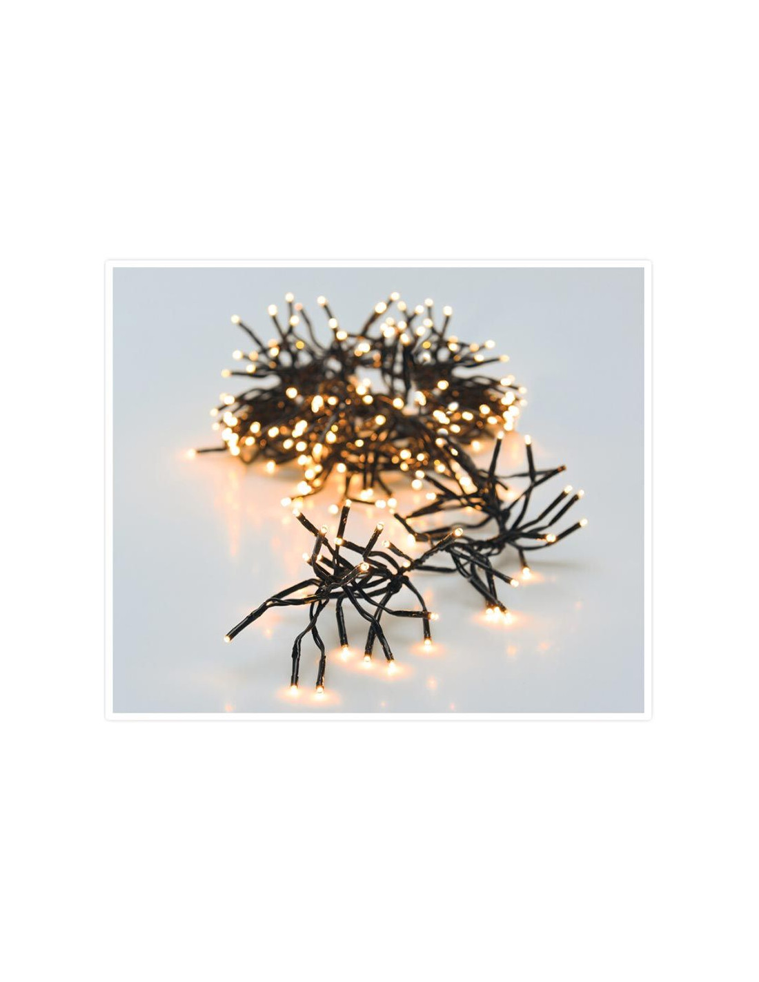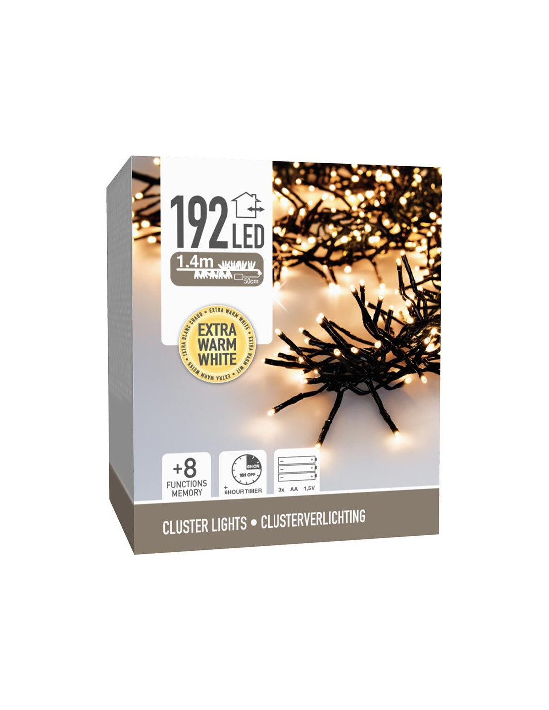 clusterverlichting met batterijbox 192 led's extra warm wit (klassiek, zacht, romantisch) 8 lichtfuncties: 1.Combination, 2. In wave, 3.Sequential, 4. Slo glo, 5. Chasing/flash, 6.Slow fade, 7.Twinkle/flash, 8.Steady on, 9.off geheugen: de laatste gekozen lichtinstelling wordt onthouden timer: 6 uur aan / 18 uur uit verlichte lengte: 140 cm aanloopsnoer: 50 cm zwart snoer lengte flexibele takjes: 4.5 cm werkt op 3x AA batterijen (niet meegeleverd)