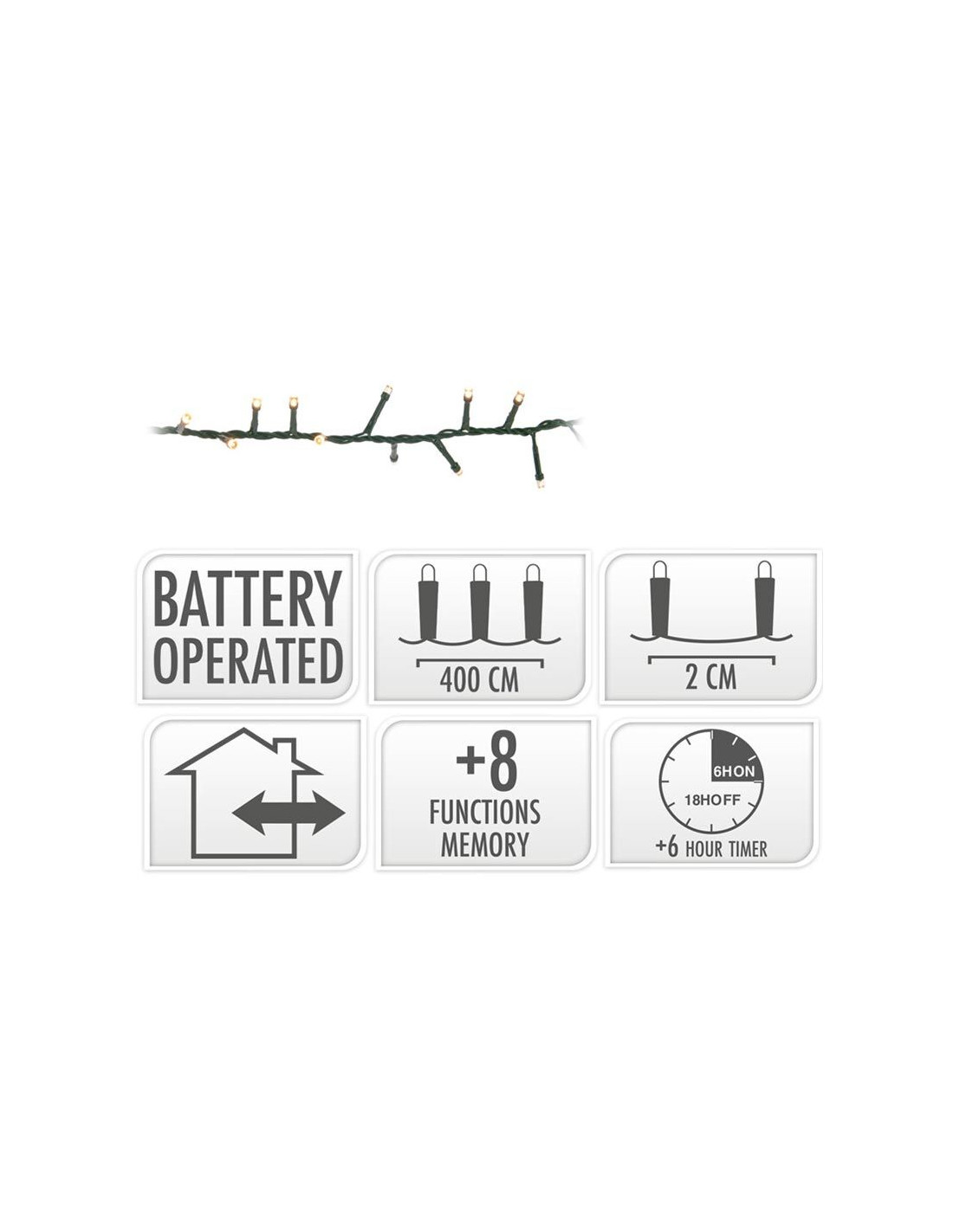 micro clusterverlichting met batterijbox 200 led's 2 kleuren: warm wit + extra warm wit 8 lichtfuncties: 1.Combination, 2. In wave, 3.Sequential, 4. Slo glo, 5. Chasing/flash, 6.Slow fade, 7.Twinkle/flash, 8.Steady on, 9.off geheugen: de laatste gekozen lichtinstelling wordt onthouden timer: 6 uur aan / 18 uur uit verlichte lengte: 400 cm aanloopsnoer: 50 cm groen snoer lengte flexibele takjes: 3 cm afstand tussen de takjes: 2 cm werkt op 3x AA batterijen (niet meegeleverd)