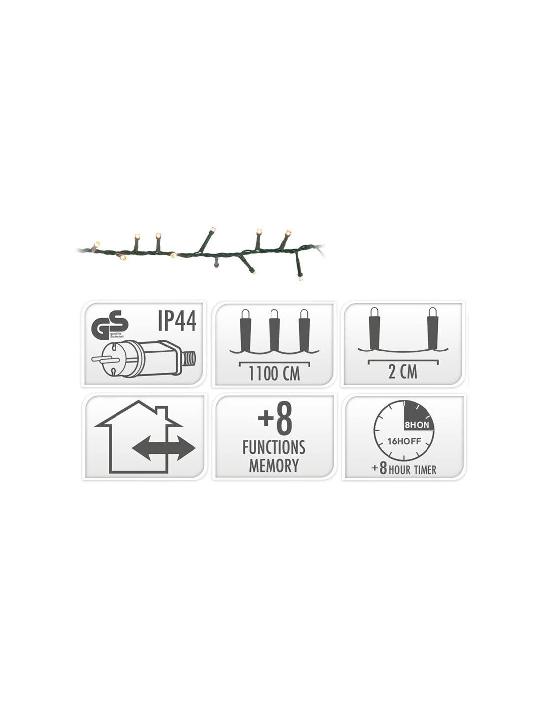 Kerstverlichting van 11 meter met 560 LED lampjes, geschikt voor een kerstboom van 180 cm, voor binnen en buiten gebruik 560 led's warm wit (modern, comfortabel, neutraal) 8 lichtfuncties: 1.Combination, 2. In waves, 3.Sequential, 4. Slo glo, 5. Chasing/flash, 6.Slow fade, 7.Twinkle/flash, 8.Steady on geheugen: de laatste gekozen lichtinstelling wordt onthouden timer: 8 uur aan / 16 uur uit verlichte lengte: 1120 cm aanloopsnoer: 300 cm groen snoer lengte takjes: 3 cm afstand tussen de takjes: 2 cm IP44 adapter: voor binnen en buiten verbruik: 3.6W