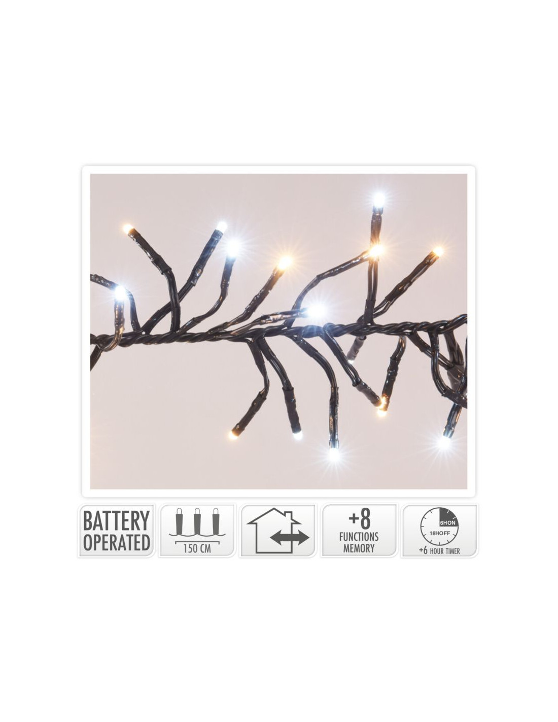 clusterverlichting met batterijbox 192 led's 2 kleuren: wit + warm wit  8 lichtfuncties: 1.Combination, 2. In wave, 3.Sequential, 4. Slo glo, 5. Chasing/flash, 6.Slow fade, 7.Twinkle/flash, 8.Steady on, 9.off geheugen: de laatste gekozen lichtinstelling wordt onthouden timer: 6 uur aan / 18 uur uit verlichte lengte: 140 cm aanloopsnoer: 50 cm zwart snoer lengte flexibele takjes: 4.5 cm werkt op 3x AA batterijen (niet meegeleverd)
