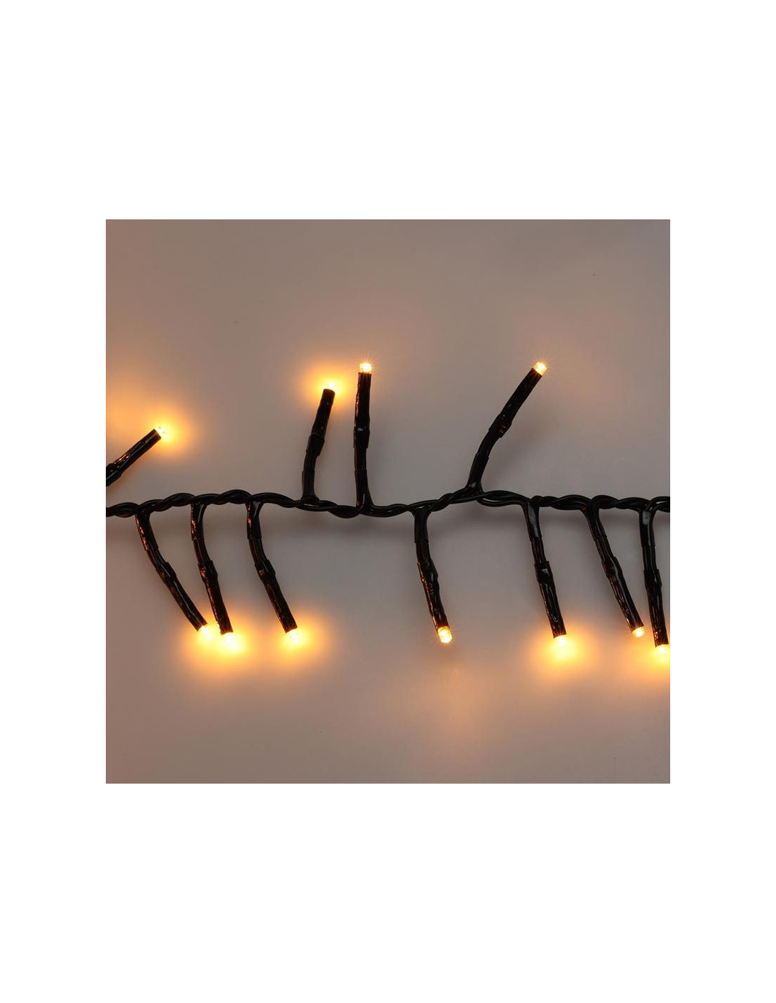 Kerstverlichting die qua dichtheid van de lampjes en de verlichte lengte tussen de traditionele cluster- en microclusterverlichting inzit. 600 led's extra warm wit (klassiek, zacht, romantisch) 8 lichtfuncties: 1.Combination, 2. In waves, 3.Sequential, 4. Slo glo, 5. Chasing/flash, 6.Slow fade, 7.Twinkle/flash, 8.Steady on geheugen: de laatste gekozen lichtinstelling wordt onthouden timer: 8 uur aan, daarna 16 uur uit verlichte lengte: 900 cm aanloopsnoer: 300 cm zwart snoer lengte takjes: 4 cm afstand tussen de takjes: 1.5 cm IP44 adapter: voor binnen en buiten verbruik: 3.6W