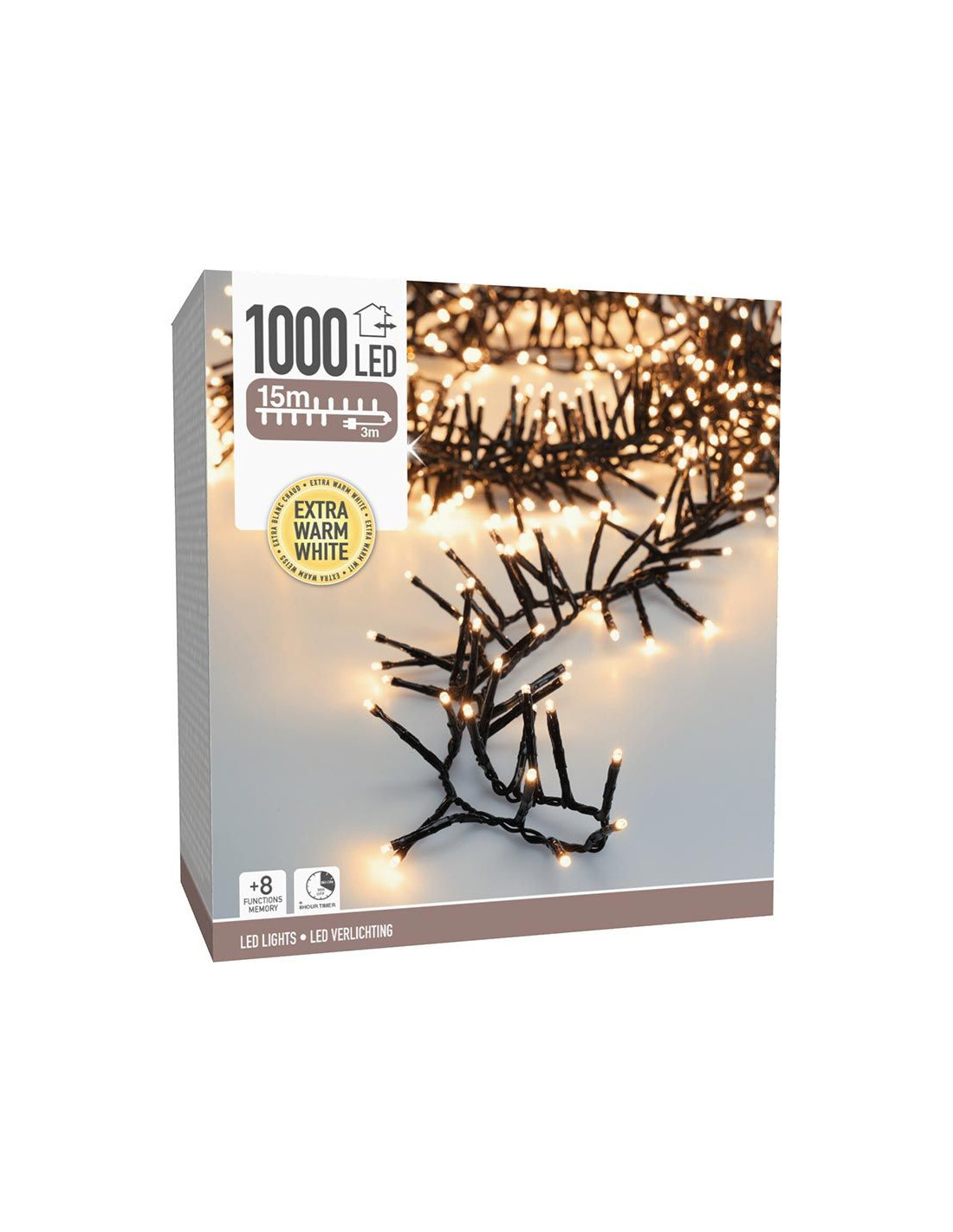 Kerstverlichting die qua dichtheid van de lampjes en de verlichte lengte tussen de traditionele cluster- en microclusterverlichting inzit. 1000 led's extra warm wit (klassiek, zacht, romantisch) 8 lichtfuncties: 1.Combination, 2. In waves, 3.Sequential, 4. Slo glo, 5. Chasing/flash, 6.Slow fade, 7.Twinkle/flash, 8.Steady on geheugen: de laatste gekozen lichtinstelling wordt onthouden timer: 8 uur aan, daarna 16 uur uit verlichte lengte: 1500 cm aanloopsnoer: 300 cm zwart snoer lengte takjes: 4 cm afstand tussen de takjes: 1.5 cm IP44 adapter: voor binnen en buiten verbruik: 6W