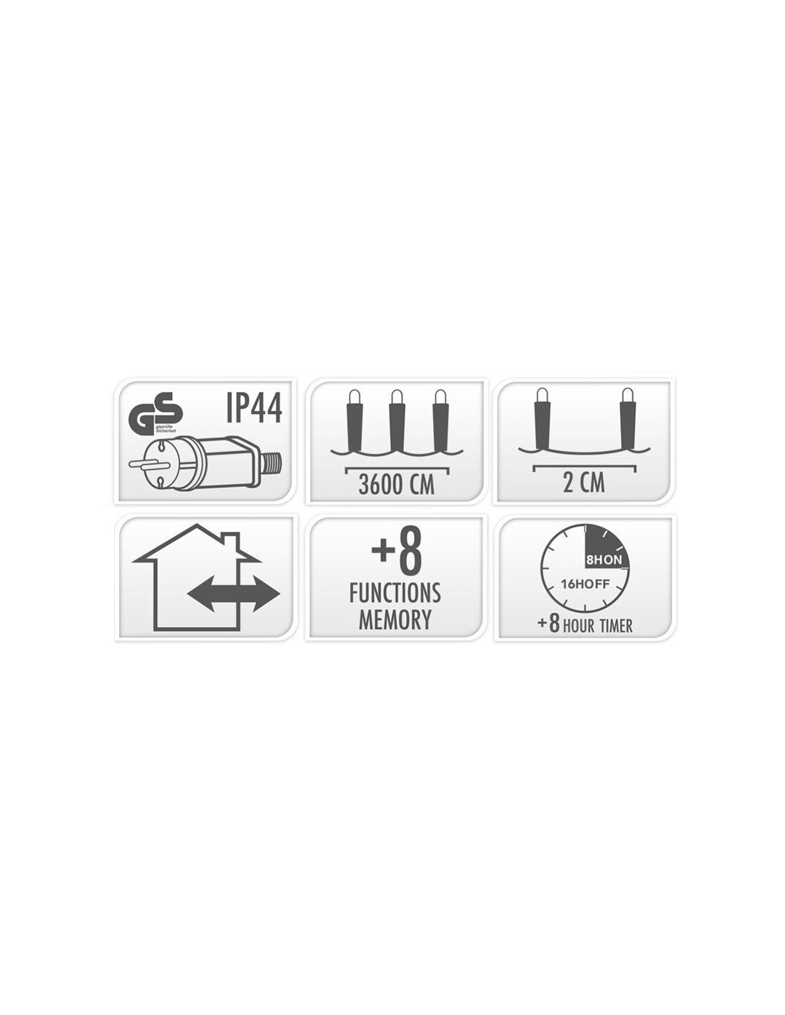 Kerstverlichting van 36 meter met 1800 LED lampjes, geschikt voor een kerstboom van 360 cm, voor binnen en buiten gebruik 1800 led's extra warm wit (klassiek, zacht, romantisch) 8 lichtfuncties: 1.Combination, 2. In waves, 3.Sequential, 4. Slo glo, 5. Chasing/flash, 6.Slow fade, 7.Twinkle/flash, 8.Steady on geheugen: de laatste gekozen lichtinstelling wordt onthouden timer: 8 uur aan / 16 uur uit verlichte lengte: 3600 cm aanloopsnoer: 300 cm groen snoer lengte takjes: 3 cm afstand tussen de takjes: 2 cm IP44 adapter: voor binnen en buiten zuinig in verbruik: 9W