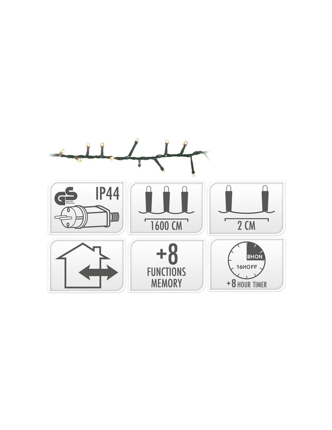 Kerstverlichting van 16 meter met 800 LED lampjes, geschikt voor een kerstboom van 240 cm, voor binnen en buiten gebruik 800 led's extra warm wit (klassiek, zacht, romantisch) 8 lichtfuncties: 1.Combination, 2. In waves, 3.Sequential, 4. Slo glo, 5. Chasing/flash, 6.Slow fade, 7.Twinkle/flash, 8.Steady on geheugen: de laatste gekozen lichtinstelling wordt onthouden timer: 8 uur aan / 16 uur uit verlichte lengte: 1600 cm aanloopsnoer: 300 cm groen snoer lengte takjes: 3 cm afstand tussen de takjes: 2 cm IP44 adapter: voor binnen en buiten zuinig in verbruik: 3.6W