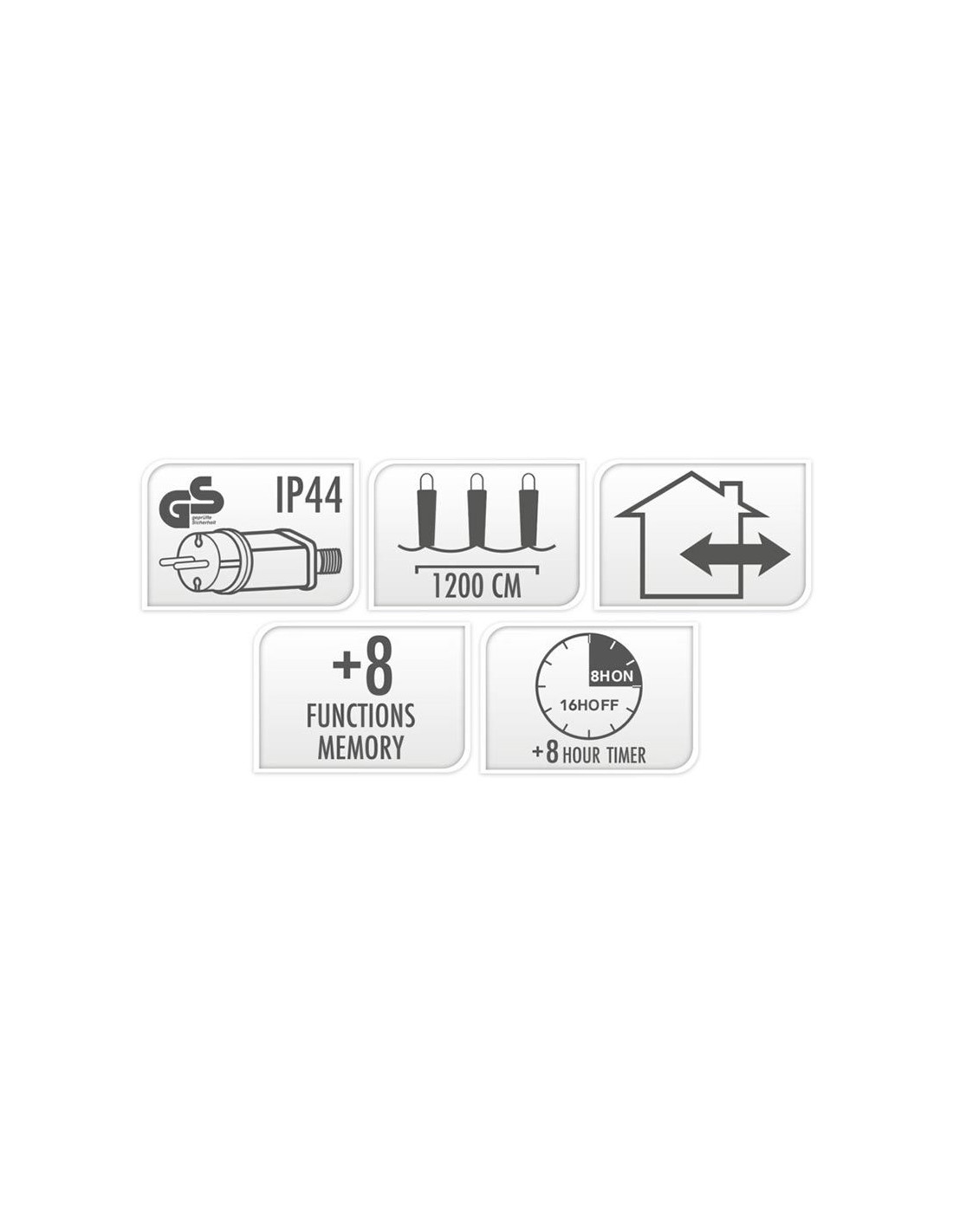 Kerstverlichting die qua dichtheid van de lampjes en de verlichte lengte tussen de traditionele cluster- en microclusterverlichting inzit. 800 led's warm wit (modern, comfortabel, neutraal) 8 lichtfuncties: 1.Combination, 2. In waves, 3.Sequential, 4. Slo glo, 5. Chasing/flash, 6.Slow fade, 7.Twinkle/flash, 8.Steady on geheugen: de laatste gekozen lichtinstelling wordt onthouden timer: 8 uur aan, daarna 16 uur uit verlichte lengte: 1200 cm aanloopsnoer: 300 cm zwart snoer lengte takjes: 4 cm afstand tussen de takjes: 1.5 cm IP44 adapter: voor binnen en buiten verbruik: 6W