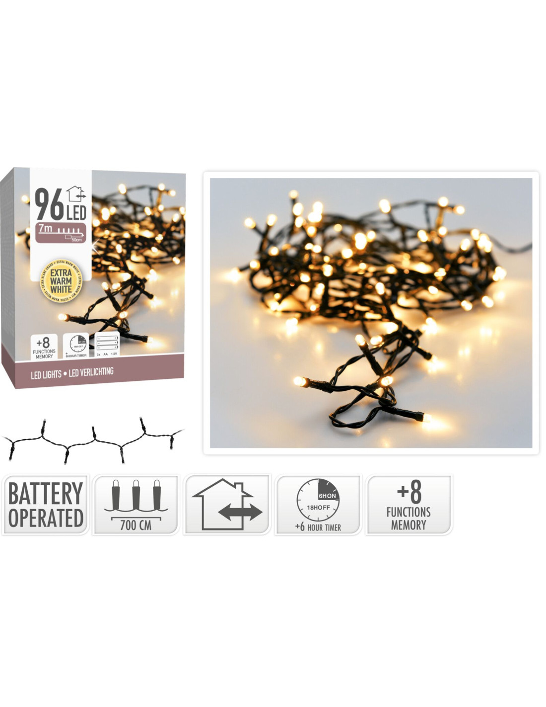 Kerstverlichting 96 led - 7m - extra warm wit - Batterij - Lichtfuncties - Geheugen - Timer