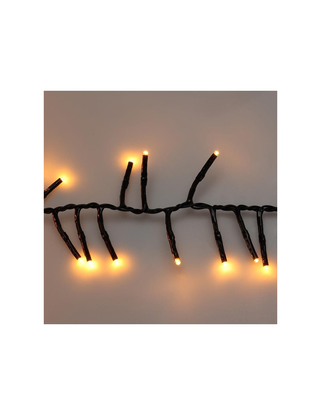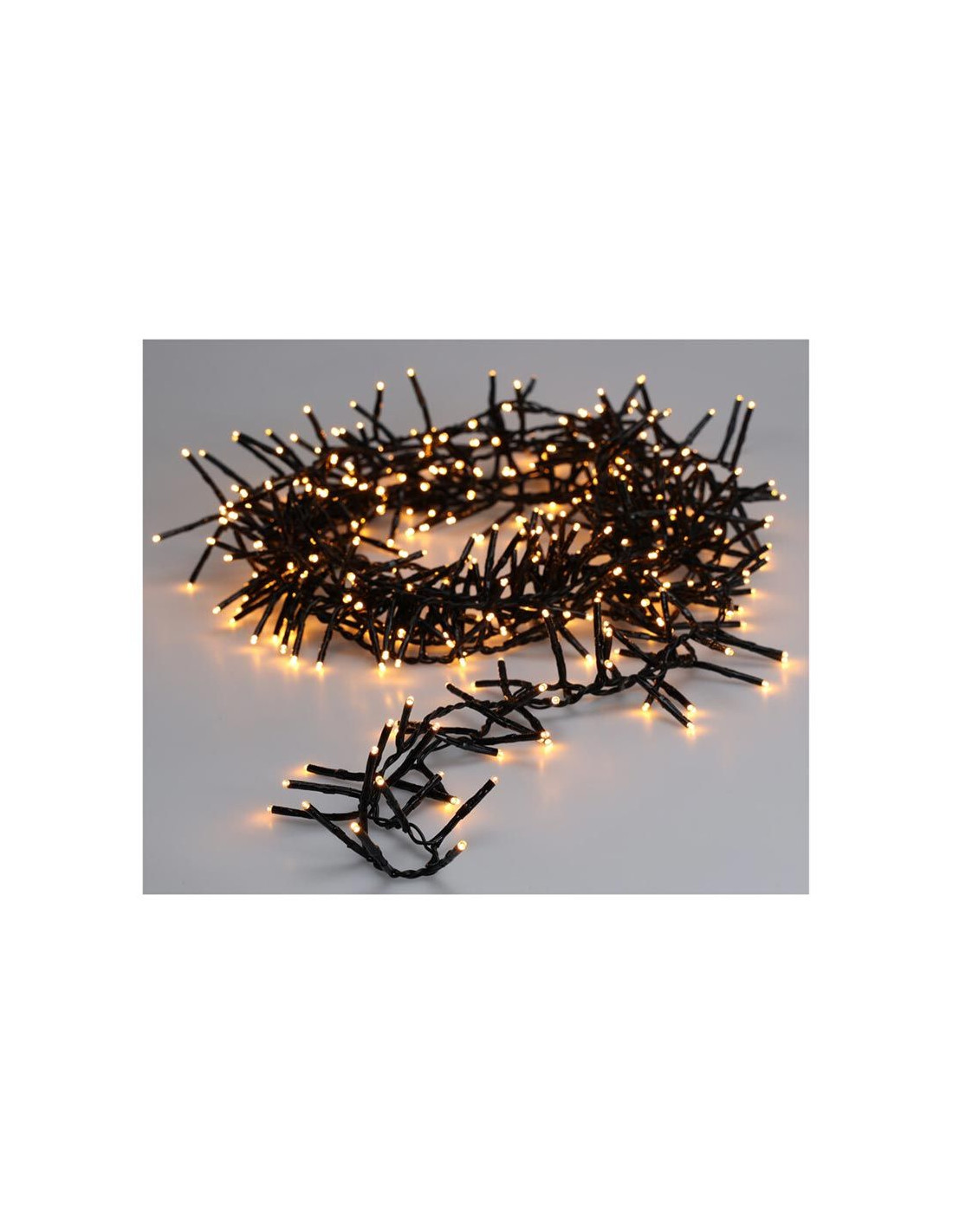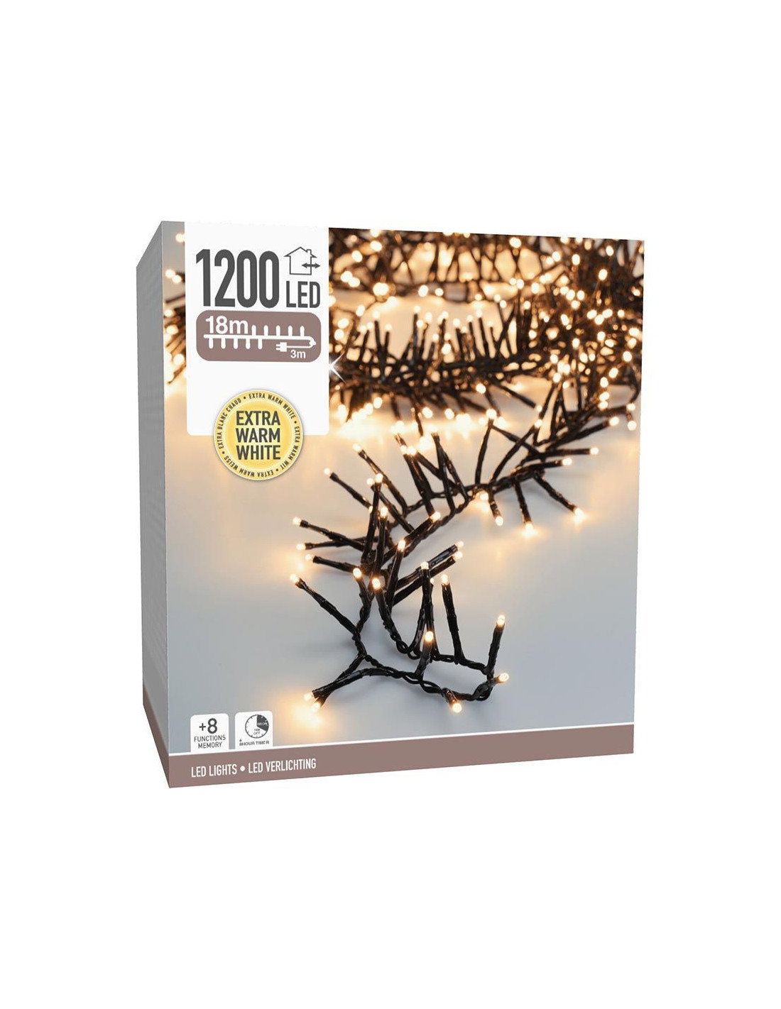 Kerstverlichting die qua dichtheid van de lampjes en de verlichte lengte tussen de traditionele cluster- en microclusterverlichting inzit. 1200 led's extra warm wit (klassiek, zacht, romantisch) 8 lichtfuncties: 1.Combination, 2. In waves, 3.Sequential, 4. Slo glo, 5. Chasing/flash, 6.Slow fade, 7.Twinkle/flash, 8.Steady on geheugen: de laatste gekozen lichtinstelling wordt onthouden timer: 8 uur aan, daarna 16 uur uit verlichte lengte: 1800 cm aanloopsnoer: 300 cm zwart snoer lengte takjes: 4 cm afstand tussen de takjes: 1.5 cm IP44 adapter: voor binnen en buiten verbruik: 7.2W