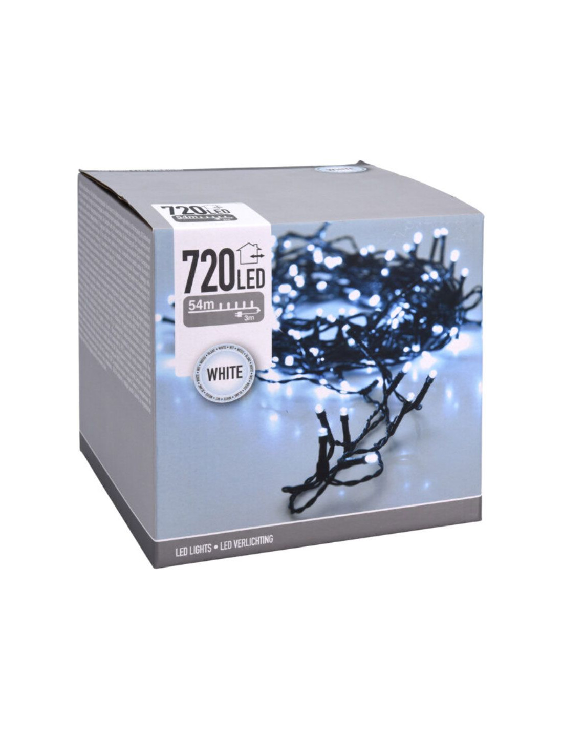 LED Lichtsnoer 54 meter, 720 lampjes, binnen en buiten Aantal LED's: 720 Afstand tussen LED's: 7.5 cm Lengte aanloopsnoer: 3 meter Lengte lichtsnoer: ca. 54 meter Lengte totaal: ca. 57 meter Kleur LED: wit Kleur snoer: groen Met adapter (beschermwaarde IP44) Geschikt voor binnen en buiten Verbruik: 6W 220-240V, 50-60Hz 3V, 15mA