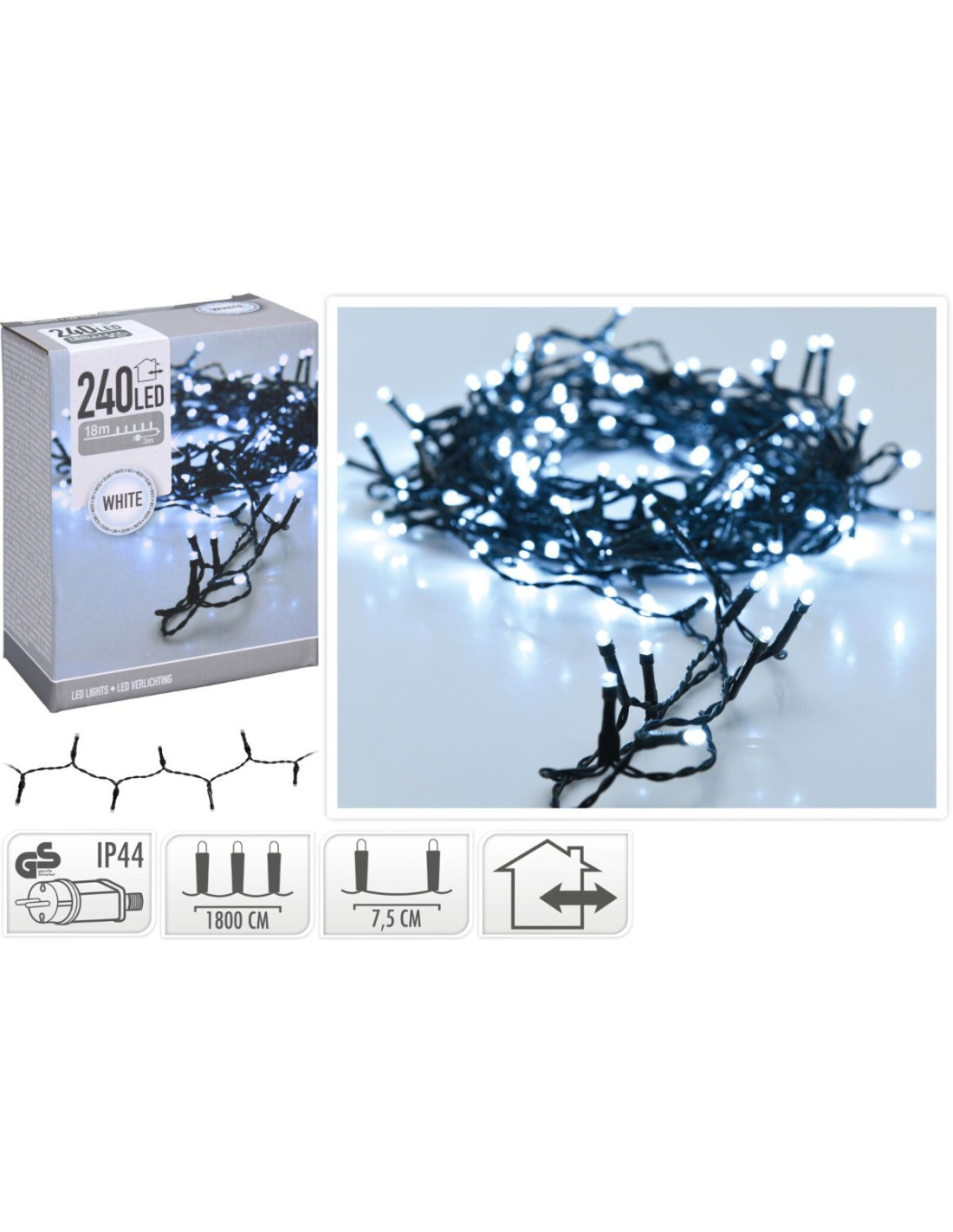 LED Lichtsnoer 18 meter, 240 lampjes, binnen en buiten Aantal LED's: 240 Afstand tussen LED's: 7.5 cm Lengte aanloopsnoer: 3 meter Lengte lichtsnoer: ca. 18 meter Lengte totaal: ca. 21 meter Kleur LED: wit Kleur snoer: groen Met adapter (beschermwaarde IP44) Geschikt voor binnen en buiten Verbruik: 3.6W 220-240V, 50-60Hz 3V, 15mA