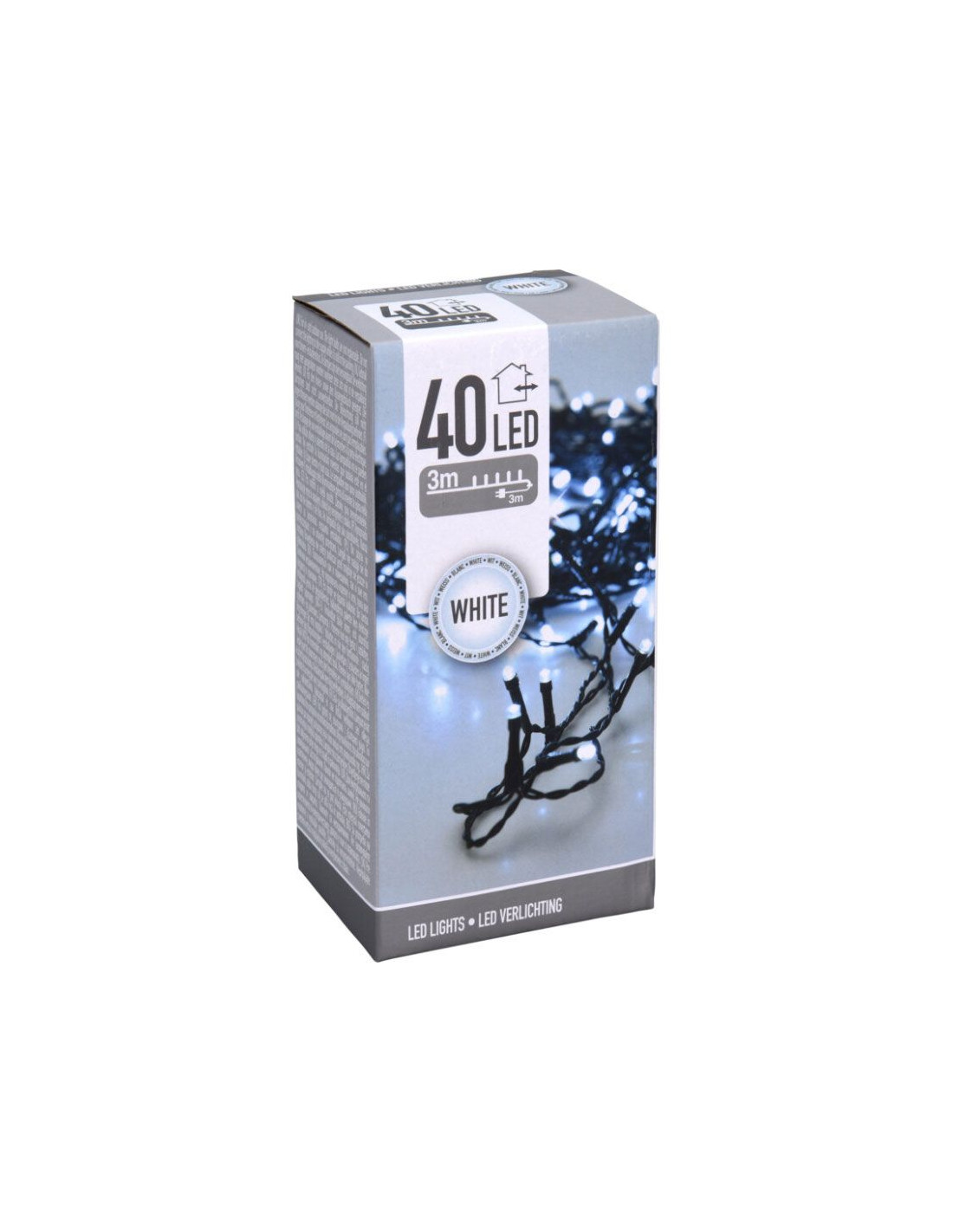 LED Lichtsnoer 3 meter, 40 lampjes, binnen en buiten Aantal LED's: 40 Afstand tussen LED's: 7.5 cm Lengte aanloopsnoer: 3 meter Lengte lichtsnoer: ca. 3 meter Lengte totaal: ca. 6 meter Kleur LED: wit Kleur snoer: groen Met adapter (beschermwaarde IP44) Geschikt voor binnen en buiten Verbruik: 1.35W 220-240V, 50-60Hz 3V, 15mA