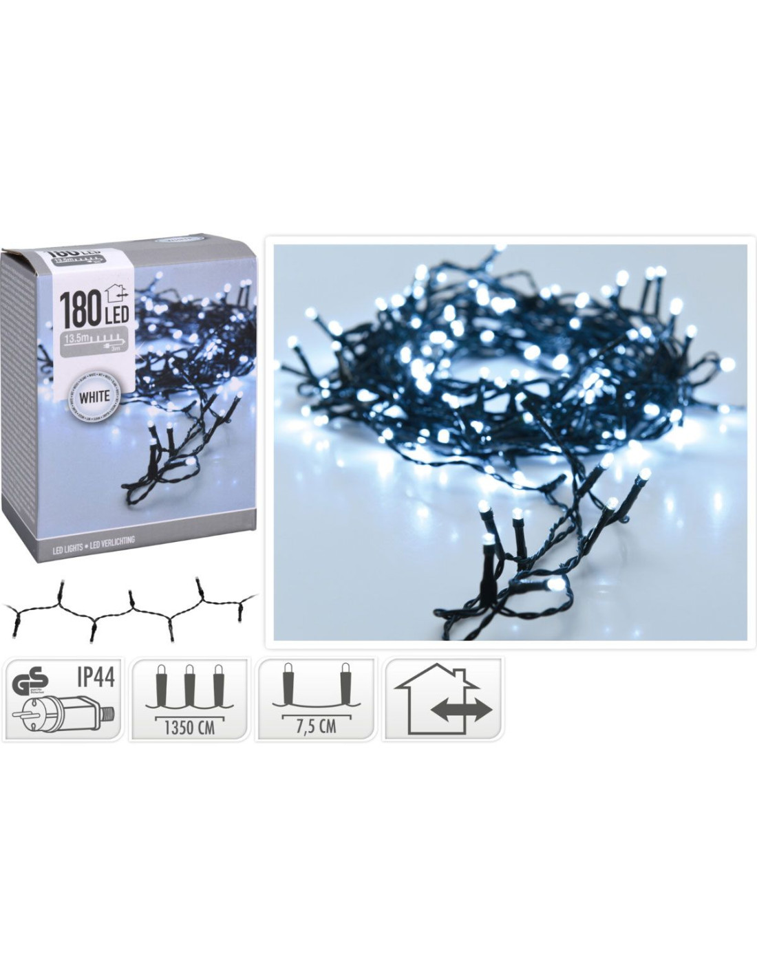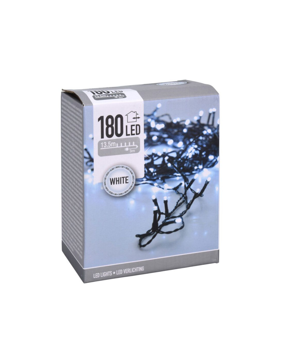 LED Lichtsnoer 13.5 meter, 180 lampjes, binnen en buiten Aantal LED's: 180 Afstand tussen LED's: 7.5 cm Lengte aanloopsnoer: 3 meter Lengte lichtsnoer: ca. 13.5 meter Lengte totaal: ca. 16.5 meter Kleur LED: wit Kleur snoer: groen Met adapter (beschermwaarde IP44) Geschikt voor binnen en buiten Verbruik: 3.6W 220-240V, 50-60Hz 3V, 15mA