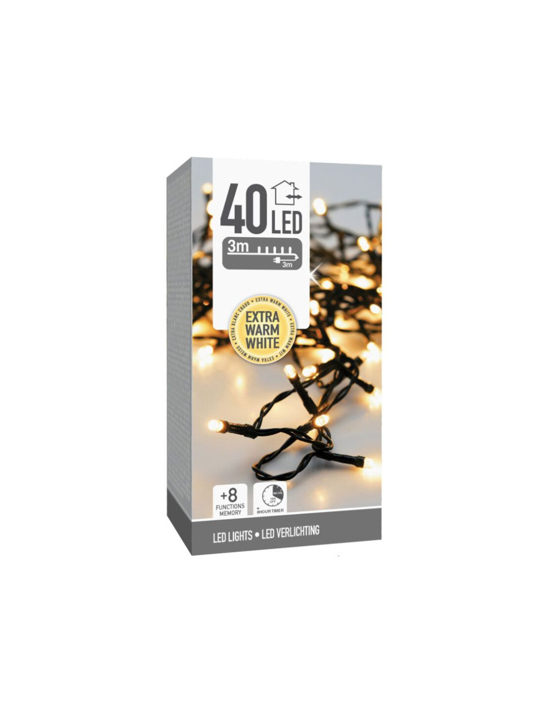 LED Lichtsnoer van 3 meter met 40 lampjes, voor binnen en buiten 40 led's extra warm wit (klassiek, zacht, romantisch) 8 lichtfuncties: 1.Combination, 2. In wave, 3.Sequential, 4. Slo glo, 5. Chasing/flash, 6.Slow fade, 7.Twinkle/flash, 8.Steady on geheugen: de laatste gekozen lichtinstelling wordt onthouden timer: 8 uur aan / 16 uur uit verlichte lengte: ca. 300 cm aanloopsnoer: 300 cm groen snoer afstand tussen de takjes: 7.5 cm IP44 adapter: voor binnen en buiten zuinig in verbruik: 1.1W