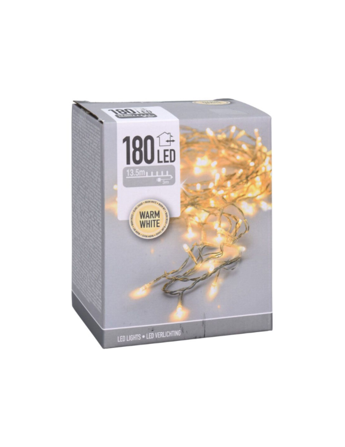 Aantal LED's: 180 Afstand tussen LED's: 7.5 cm Lengte aanloopsnoer: 3 meter Lengte lichtsnoer: ca. 13.5 meter Lengte totaal: 16.5 meter Kleur LED: warm wit Kleur snoer: transparant Met adapter (beschermwaarde IP44) Geschikt voor binnen en buiten Verbruik: 3.6W 220-240V, 50-60Hz 3V, 15mA