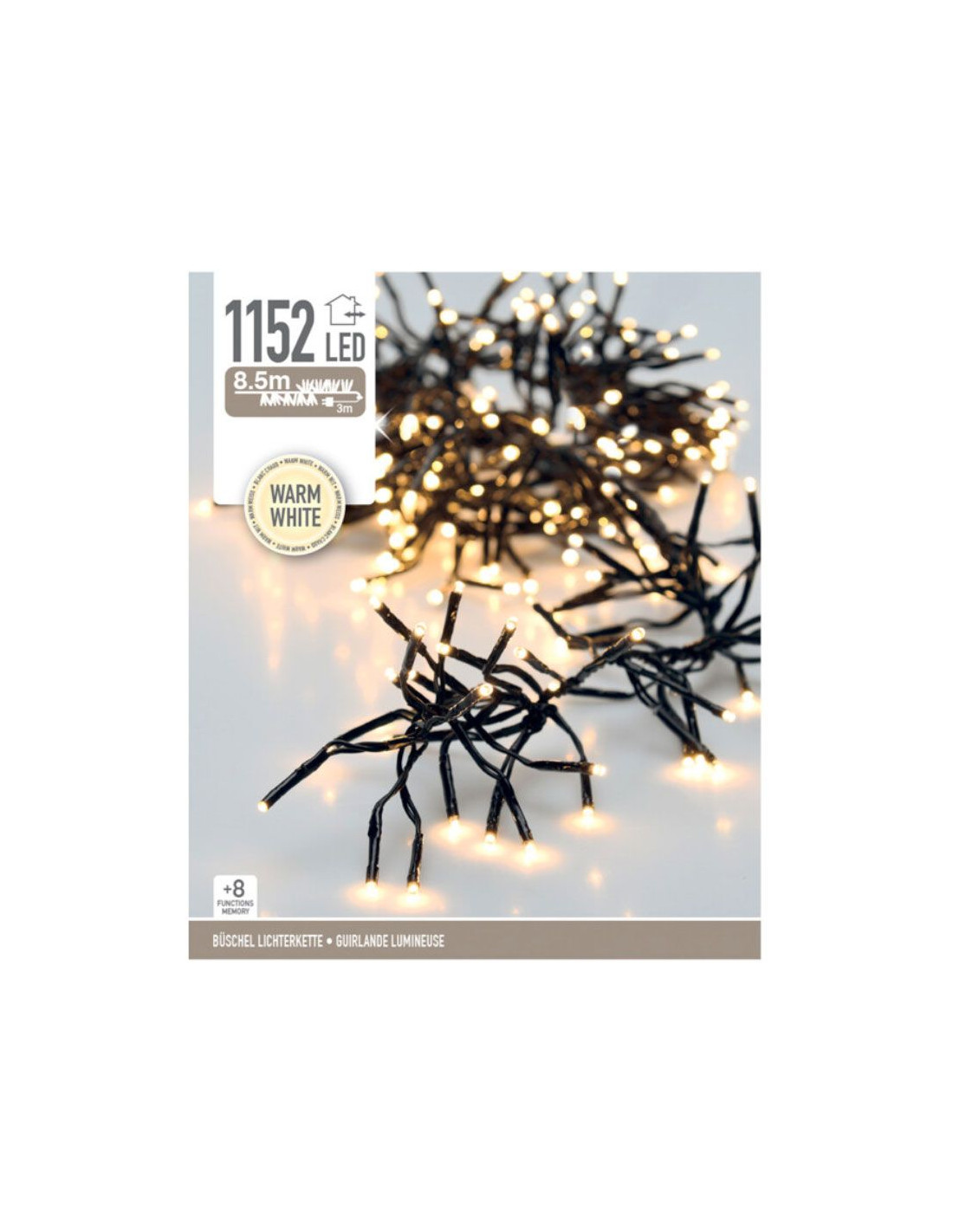 een clustersnoer waarbij de LED lampjes nog dichter bij elkaar zitten dan bij de standaard clusterverlichting, met maar liefst 1152 energiezuinige LED's in de kleur warm wit clusterlengte: 8.5 meter, aanloopsnoer 3 meter controller met 8 verschillende functies, het geheugen bewaart de laatst gebruikte instelling met timer: 8 uur aan - 16 uur uit geschikt voor binnen en buiten (Beschermwaarde IP44) zwart snoer verbruik: 7.2W 3V, 3mA